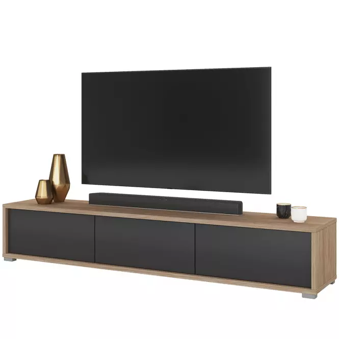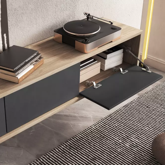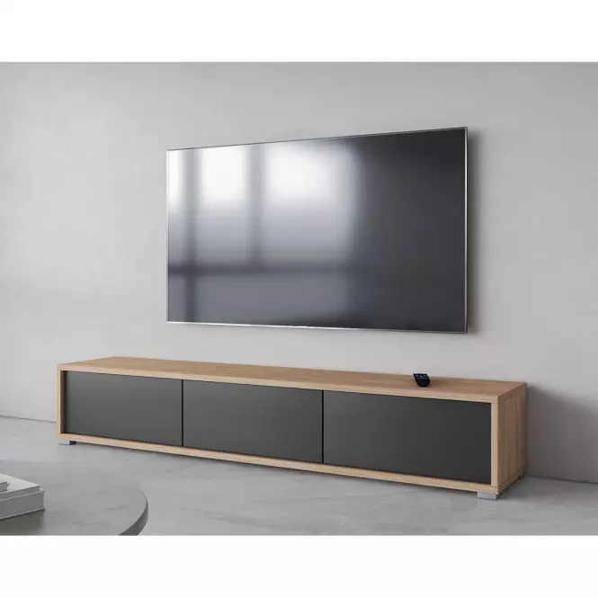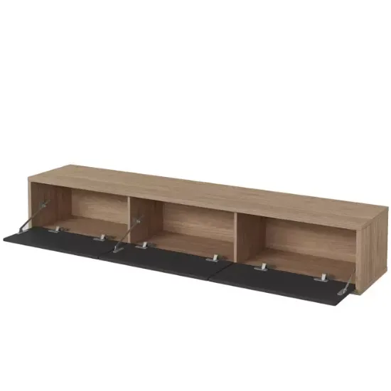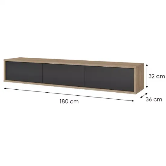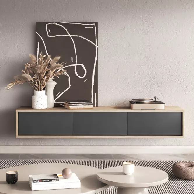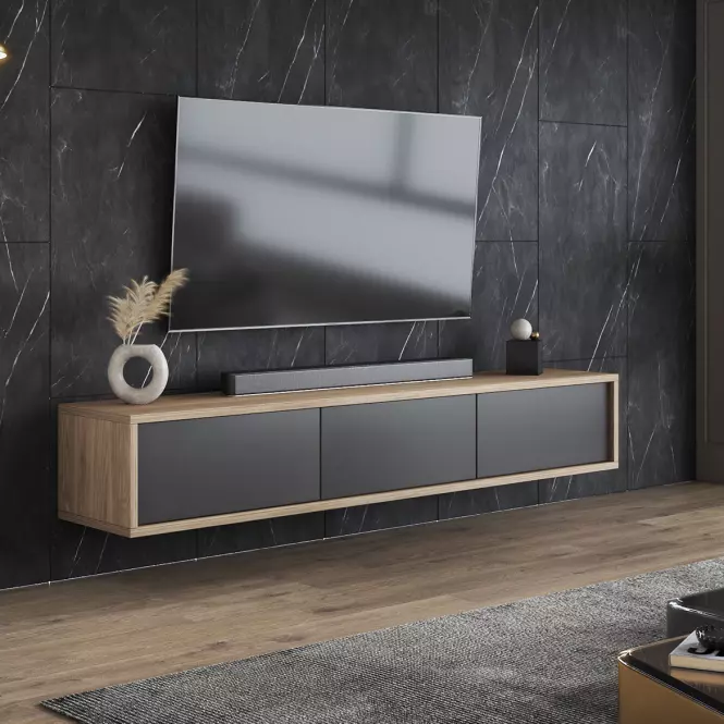 Szafka Frida wyróżnia się opcją podwieszania, co czyni ją nie tylko efektownym, ale i praktycznym elementem wyposażenia. Uniesiona nad ziemią, zapewnia wizualną lekkość i pozwala na swobodne wykorzystanie przestrzeni pod nią – idealne rozwiązanie do salonów, w których liczy się każdy centymetr. Przestronne wnętrze szafki stwarza idealne warunki do przechowywania sprzętu multimedialnego, kabli oraz akcesoriów, pomagając w utrzymaniu porządku wokół telewizora.
