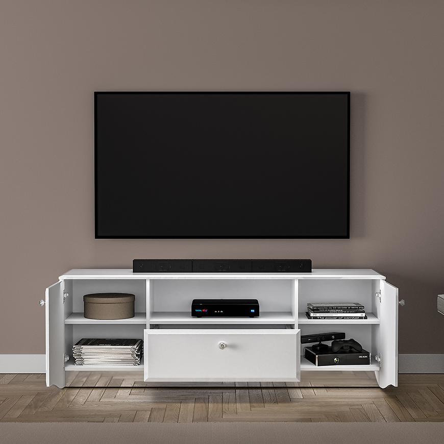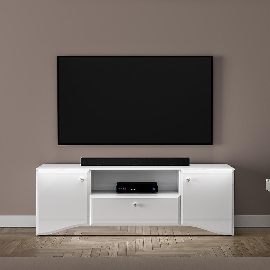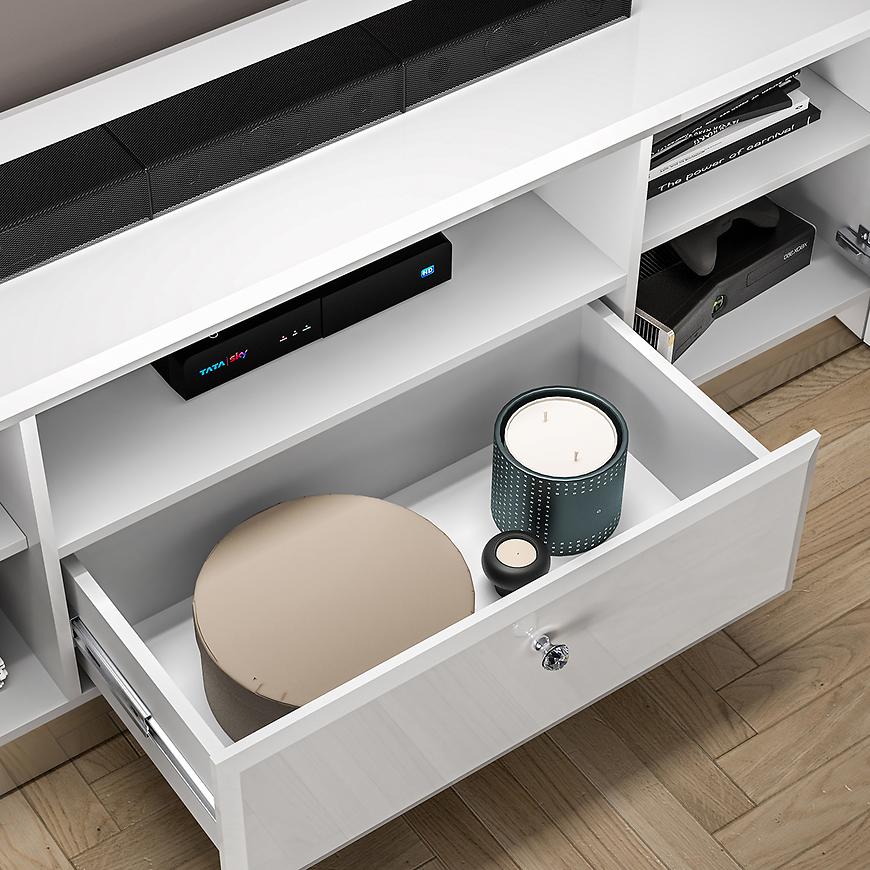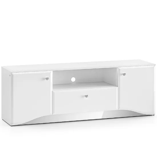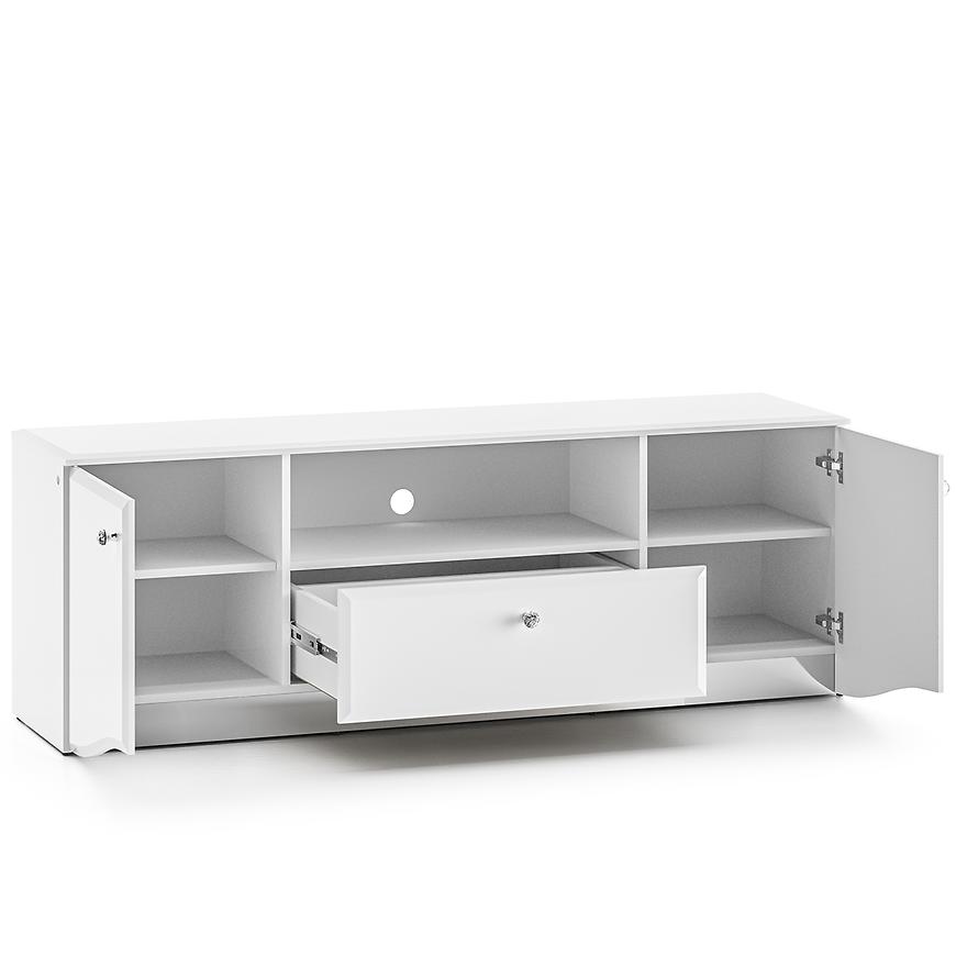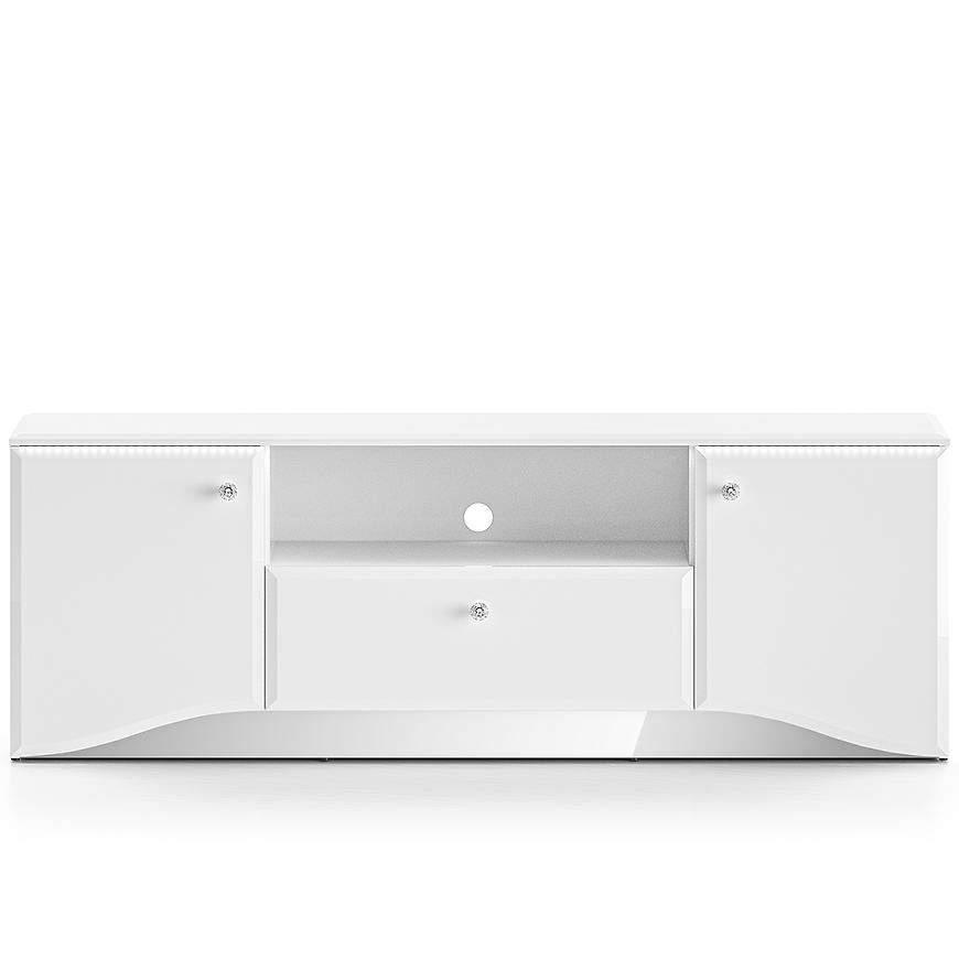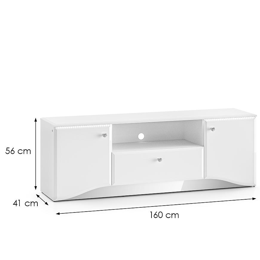 Szafka RTV Glamour 03 Biały Połysk to elegancki mebel w nowoczesnym stylu, wyróżniający się białym wykończeniem w połysku. Wykonana z trwałej płyty MDF, posiada dwudrzwiową konstrukcję oraz praktyczną szufladę, oferując funkcjonalność i styl w jednym. Szerokość 160 cm sprawia, że idealnie pasuje pod telewizor, a nowoczesna forma doskonale dopełni wnętrza salonu. Wymaga samodzielnego montażu.