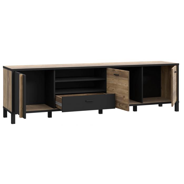Trzydrzwiowa szafka RTV Hayato z jedną szufladą. Szafka dostępna w stonowanym kolorze barw ziemi, świerk alpejski w połączeniu z głęboką czernią. To połączenie nadaje jej niepowtarzany kontrast. Kolorystyka doskonale sprawdzi się w surowym industrialnym lofcie jak i w klasycznym wnętrzu. Długie pionowe uchwyty biegnącie wzdłuż frontów to jedyny element dekoracyjny kolekcji Yayato. Szafka pakowana w dwie paczki o wymiarach: 1/2. 69,6x46,4x18,7; 2/2. 210,8x45,0x5,2 cm.