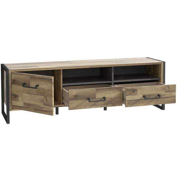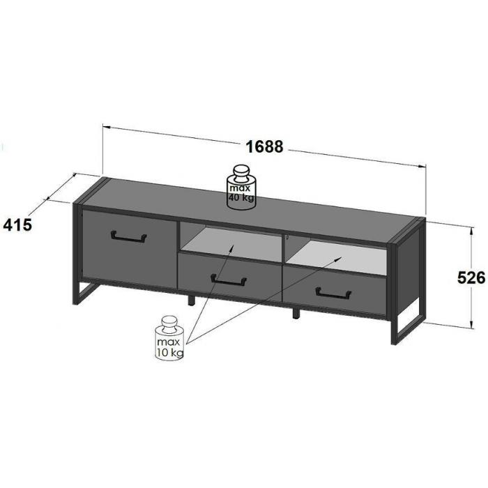 Szafka RTV Hud marki Forte posiada dwie szuflady z metalowymi, ergonomicznymi uchwytami w kolorze czarnym. Szafka RTV daje idealne miejsce na Twój telewizor.
