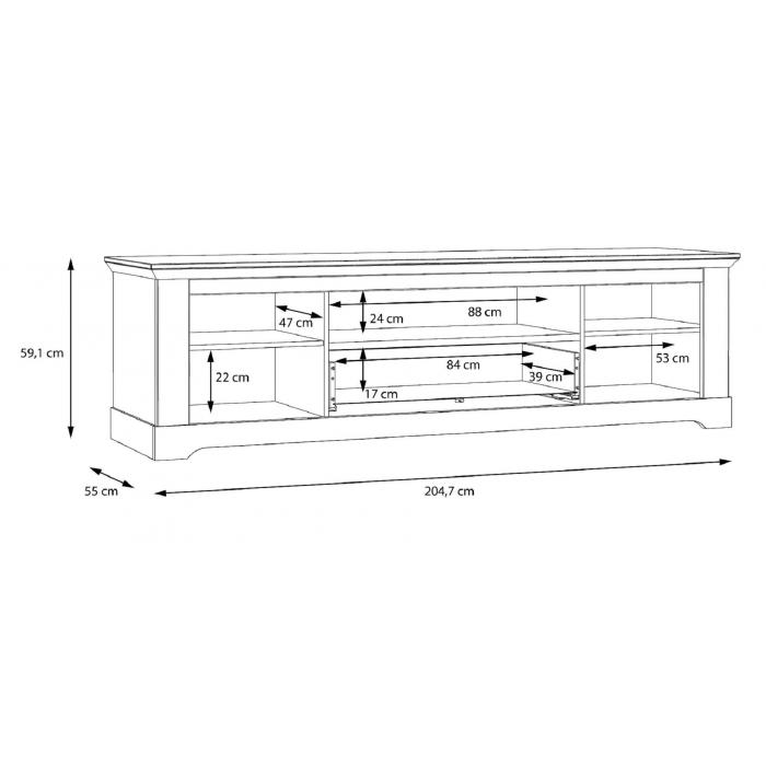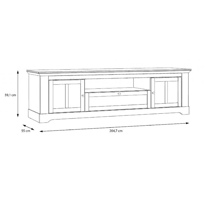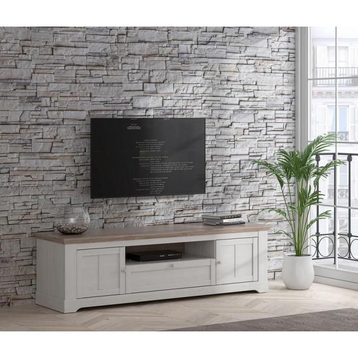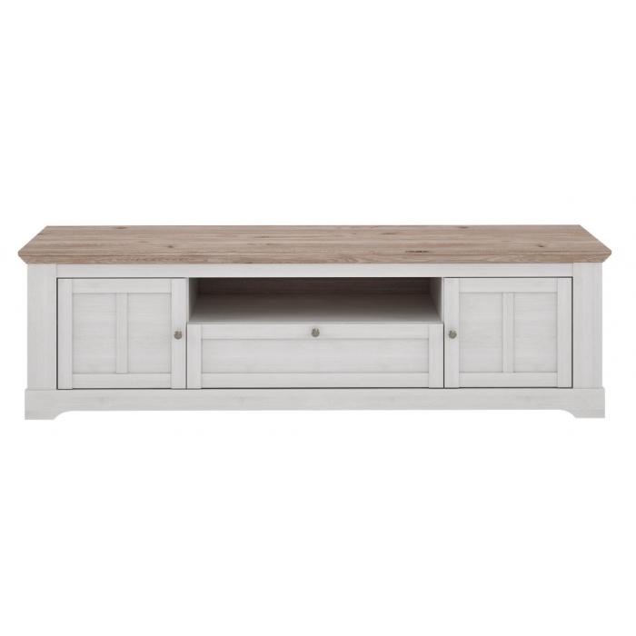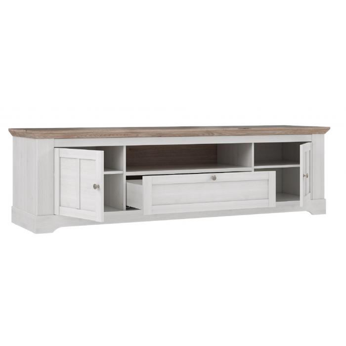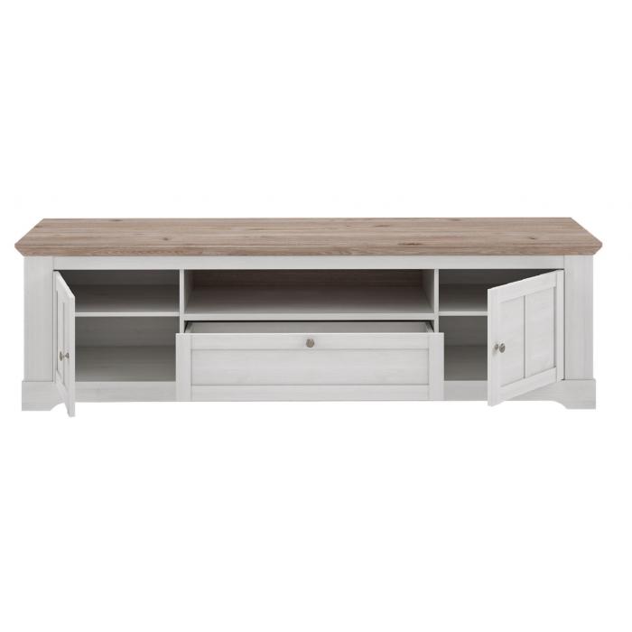 Szafka RTV z kolekcji Iloppa idealnie wpisze się w aranżację salonu czy pokoju dziennego i wprowadzi do wnętrza odrobinę prowansalskiego klimatu. Praktyczny mebel wykonany został w połączeniu jasnego Dębu Śnieżnego z Dębem Nelson. Szafka posiada dużo przestrzeni na przechowywanie sprzętu RTV: otwartą półkę, samodomykającą się szufladę oraz dwie szafki wyposażone w system cichego domyku.