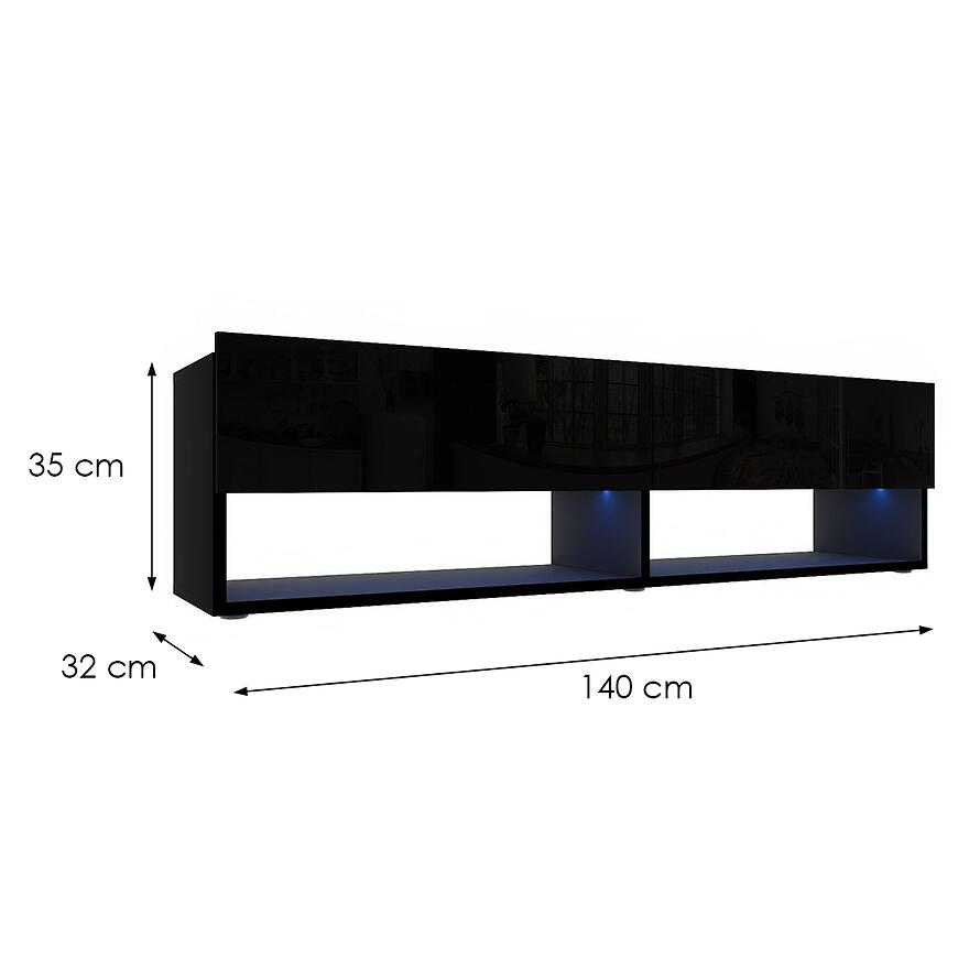 Szafka RTV Izumi 140 BL to nowoczesny mebel w eleganckiej czerni, łączący matowe i połyskujące fronty. Wykonana z wytrzymałej płyty laminowanej, posiada 2 praktyczne szuflady na akcesoria multimedialne. Istnieje możliwość wyposażenia w oświetlenie LED dostępne za dopłatą, co dodaje całości stylowego charakteru.
