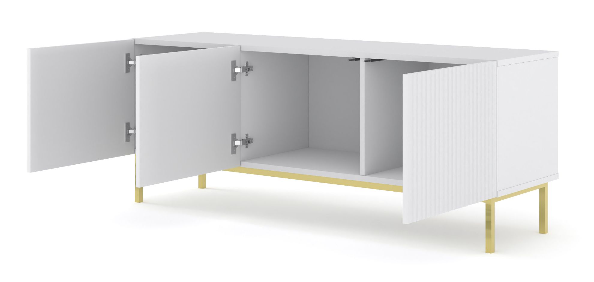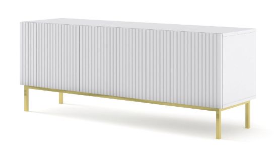 Metalowe nogi szafki na ramie, utrzymane w efektownym złotym kolorze, nadają całości lekkiego subtelnego blasku, co sprawia, że mebel staje się nie tylko praktycznym elementem, ale również eleganckim dodatkiem do salonu.