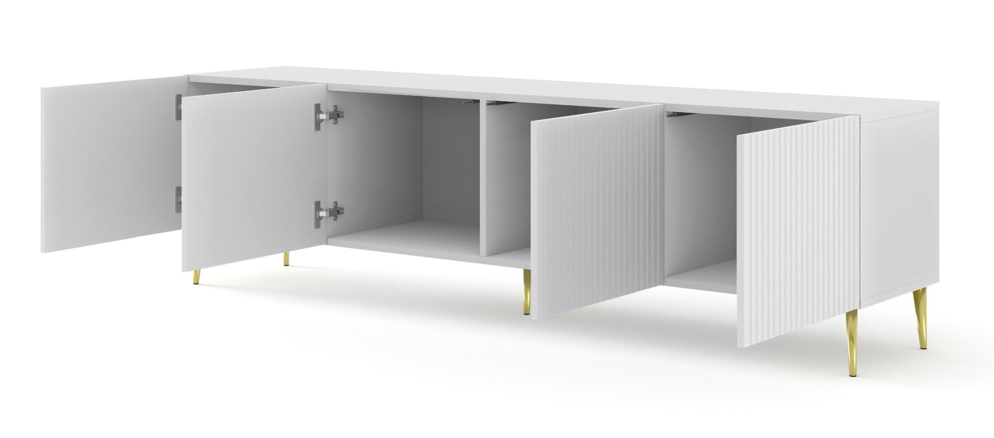 Metalowe nogi szafki na szpilce, utrzymane w efektownym złotym kolorze, nadają całości lekkiego subtelnego blasku, co sprawia, że mebel staje się nie tylko praktycznym elementem, ale również eleganckim dodatkiem do salonu.