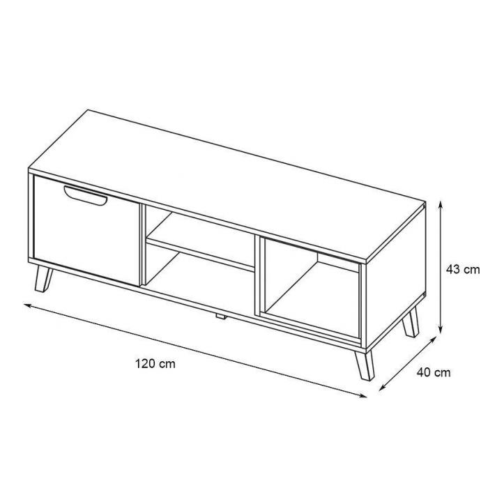 Szafka wyposażona jest w jedno drzwi, za którym kryje się przestronna półka. Taka konstrukcja pozwala na wygodne przechowywanie sprzętu RTV, pilotów, kabli lub innych akcesoriów multimedialnych, utrzymując porządek w salonie. Otwierane drzwi ułatwiają szybki dostęp do zawartości, a brak szuflad zapewnia prosty i minimalistyczny wygląd.