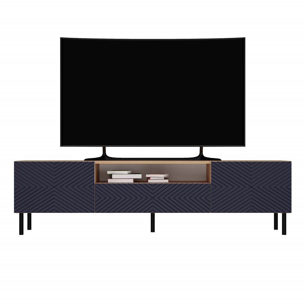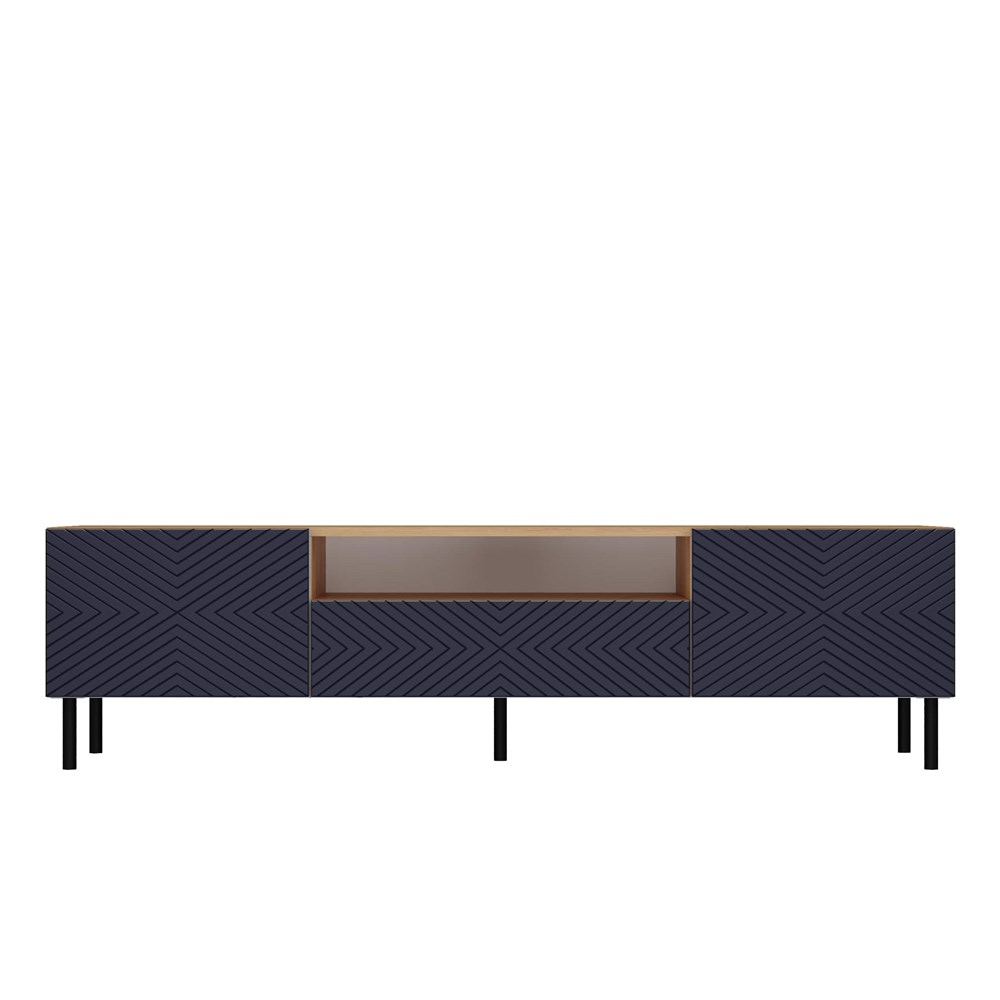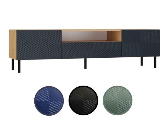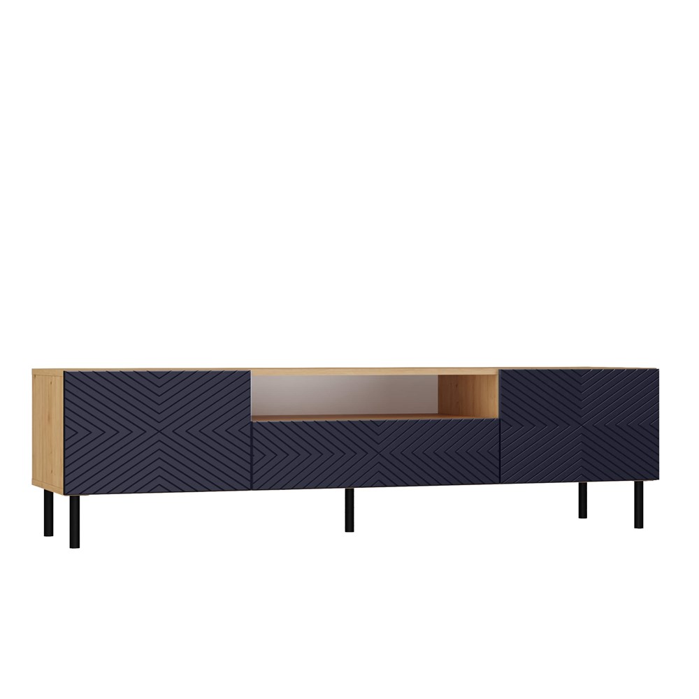 Szafka RTV Jula 160K w kolorze granat/dąb artisan posiada ryflowane fronty drzwi imitujące wzór kwadratu. Materiał wykonania to korpus płyta wiórowa laminowana 16 mm, front - płyta MDF o grubości 18 mm, melaminowana, frezowana, oklejona folią. Szafka zajmuje niewiele miejsca, doskonale sprawdzi się zarówno w małych jak i dużych pomieszczeniach. Nowoczesny oraz minimalistyczny wygląd doskonale pasuje do obecnego wzornictwa sprzętu RTV. Prosta konstrukcja gwarantuje łatwość montażu oraz niezawodność w użytkowaniu. Dodatkowo szafka ma okrągłe metalowe nogi o wysokości 13 cm oraz metalowe/stalowe zawiasy z możliwością dokładnej regulacji.