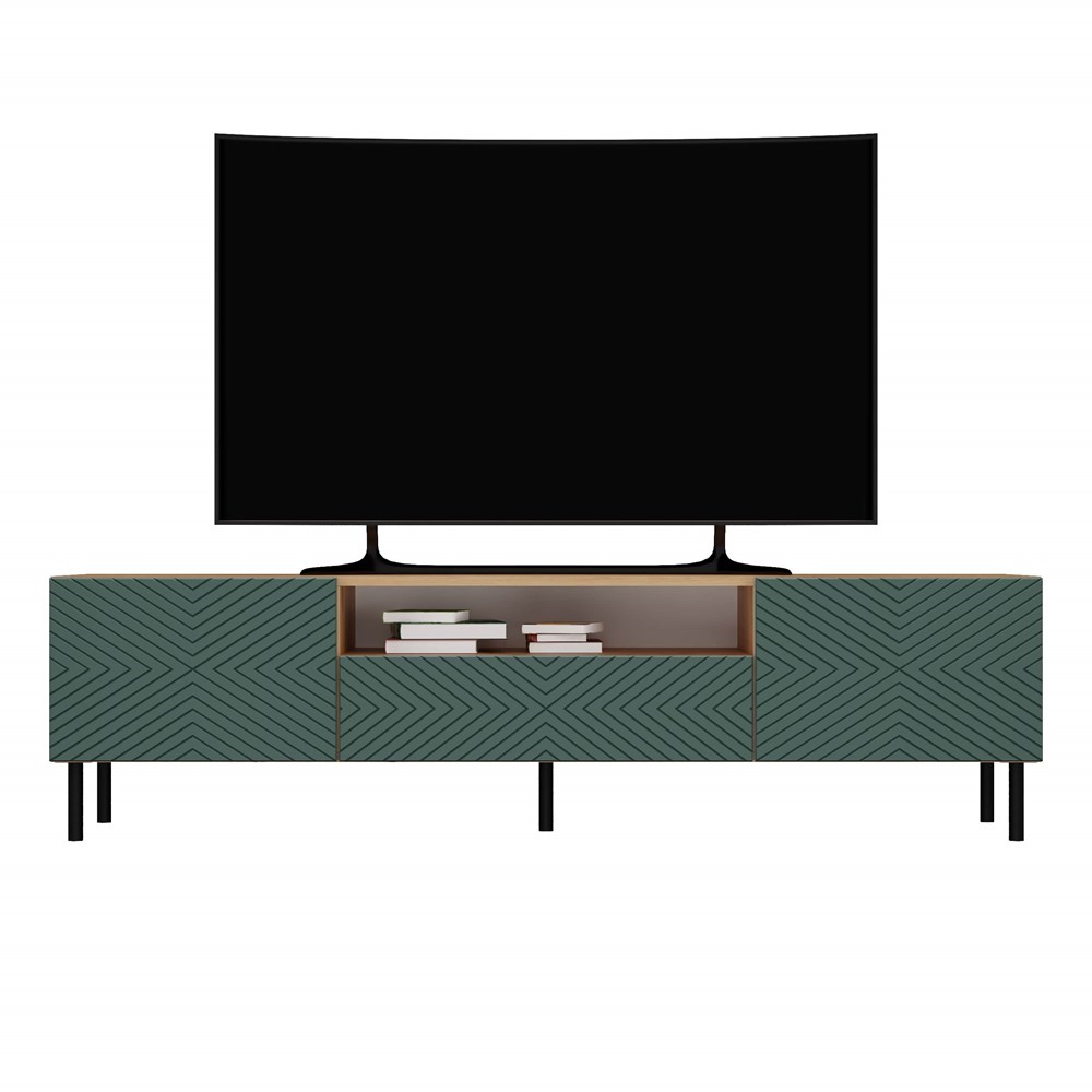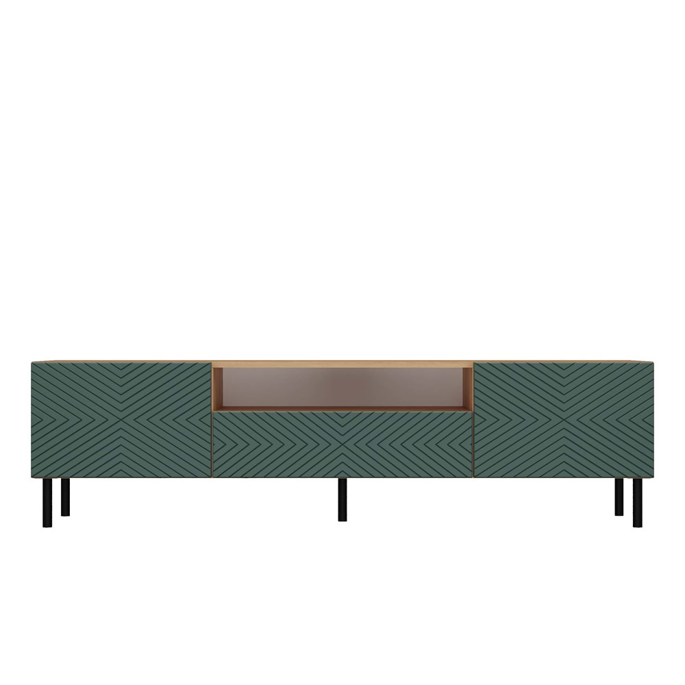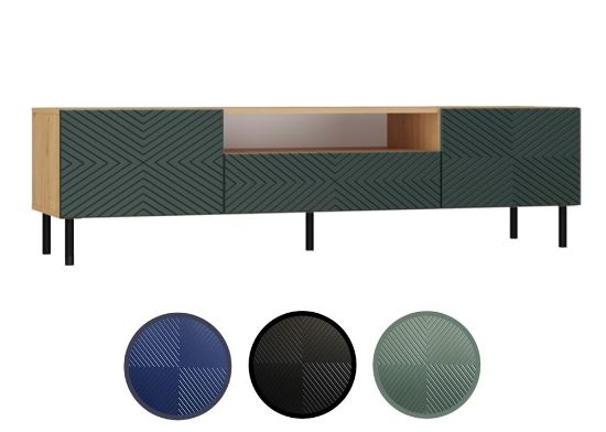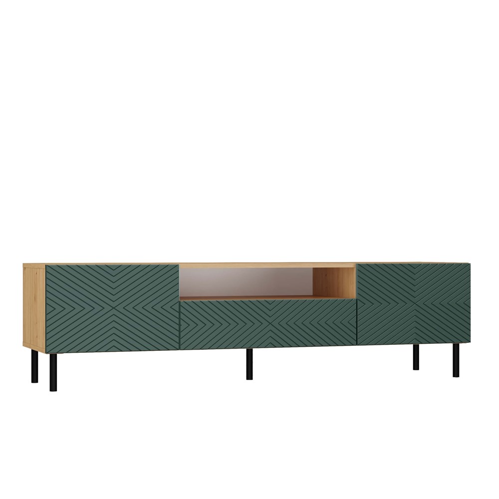 Szafka RTV Jula 160K w kolorze zielony/dąb artisan posiada ryflowane fronty drzwi imitujące wzór kwadratu. Materiał wykonania to korpus płyta wiórowa laminowana 16 mm, front - płyta MDF o grubości 18 mm, melaminowana, frezowana, oklejona folią. Szafka zajmuje niewiele miejsca, doskonale sprawdzi się zarówno w małych jak i dużych pomieszczeniach. Nowoczesny oraz minimalistyczny wygląd doskonale pasuje do obecnego wzornictwa sprzętu RTV. Prosta konstrukcja gwarantuje łatwość montażu oraz niezawodność w użytkowaniu. Dodatkowo szafka ma okrągłe metalowe nogi o wysokości 13 cm oraz metalowe/stalowe zawiasy z możliwością dokładnej regulacji.