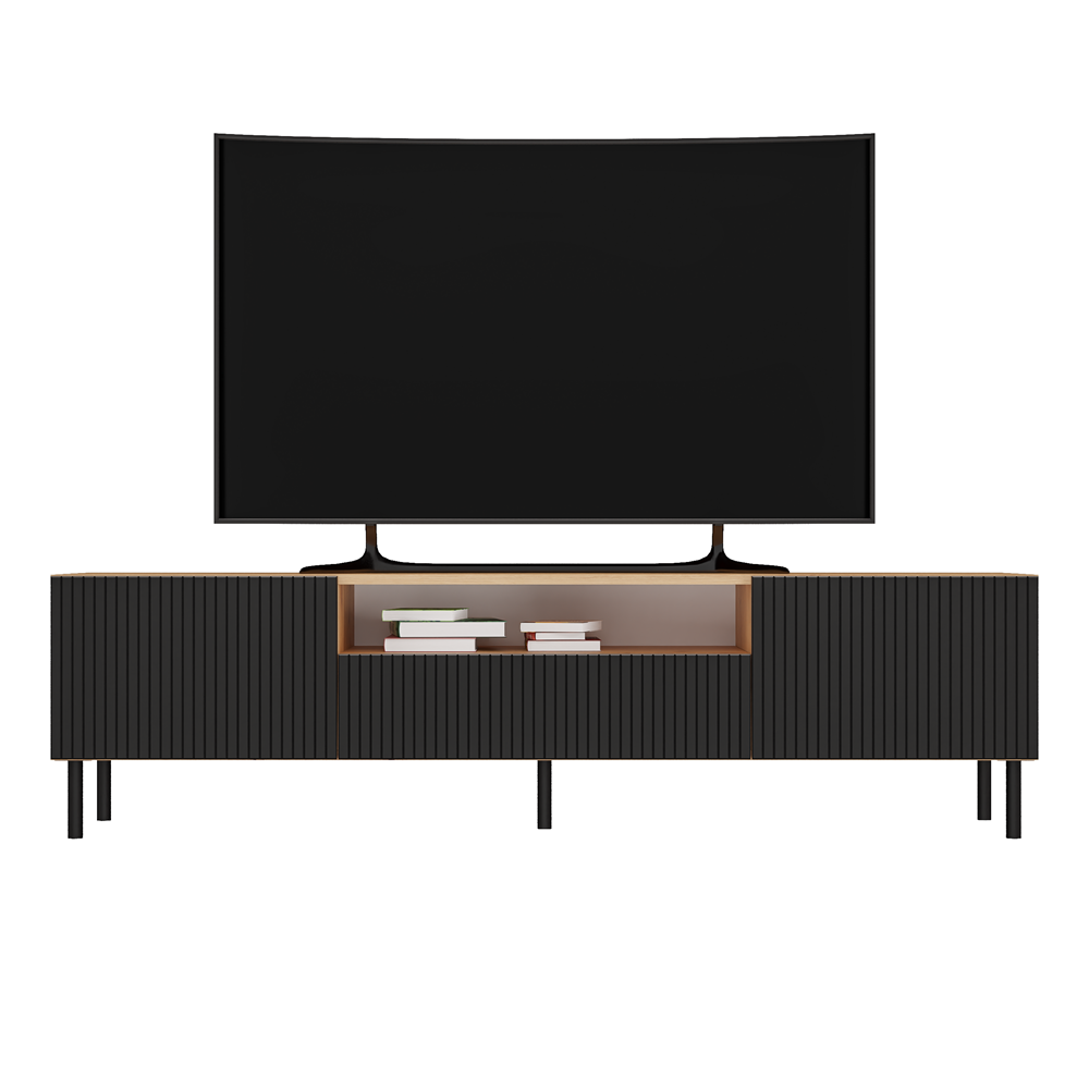 Szafka RTV Jula 160S w kolorze czarny/dąb artisan posiada ryflowane pionowe fronty drzwi imitujące lamele. Materiał wykonania to korpus płyta wiórowa laminowana 16 mm, front - płyta MDF o grubości 18 mm, melaminowana, frezowana, oklejona folią. Szafka zajmuje niewiele miejsca, doskonale sprawdzi się zarówno w małych jak i dużych pomieszczeniach. Nowoczesny oraz minimalistyczny wygląd doskonale pasuje do obecnego wzornictwa sprzętu RTV. Prosta konstrukcja gwarantuje łatwość montażu oraz niezawodność w użytkowaniu. Dodatkowo szafka ma okrągłe metalowe nogi o wysokości 13 cm oraz metalowe/stalowe zawiasy z możliwością dokładnej regulacji.