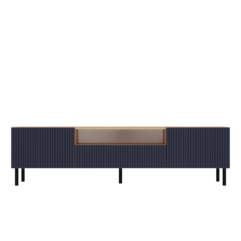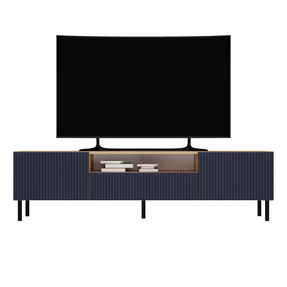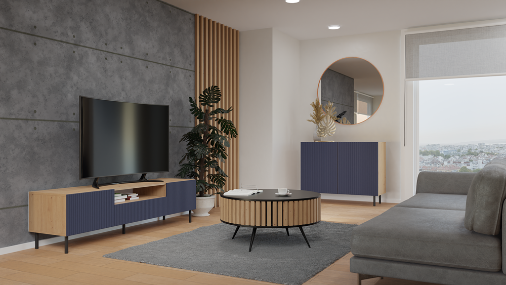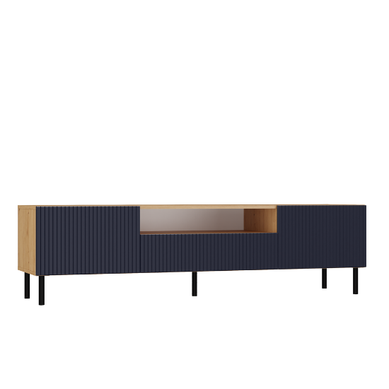 Szafka RTV Jula 160S w kolorze granat/dąb artisan posiada ryflowane pionowe fronty drzwi imitujące lamele. Materiał wykonania to korpus płyta wiórowa laminowana 16 mm, front - płyta MDF o grubości 18 mm, melaminowana, frezowana, oklejona folią. Szafka zajmuje niewiele miejsca, doskonale sprawdzi się zarówno w małych jak i dużych pomieszczeniach. Nowoczesny oraz minimalistyczny wygląd doskonale pasuje do obecnego wzornictwa sprzętu RTV. Prosta konstrukcja gwarantuje łatwość montażu oraz niezawodność w użytkowaniu. Dodatkowo szafka ma okrągłe metalowe nogi o wysokości 13 cm oraz metalowe/stalowe zawiasy z możliwością dokładnej regulacji.