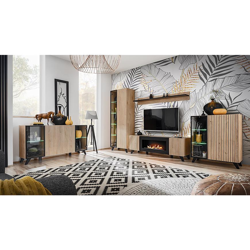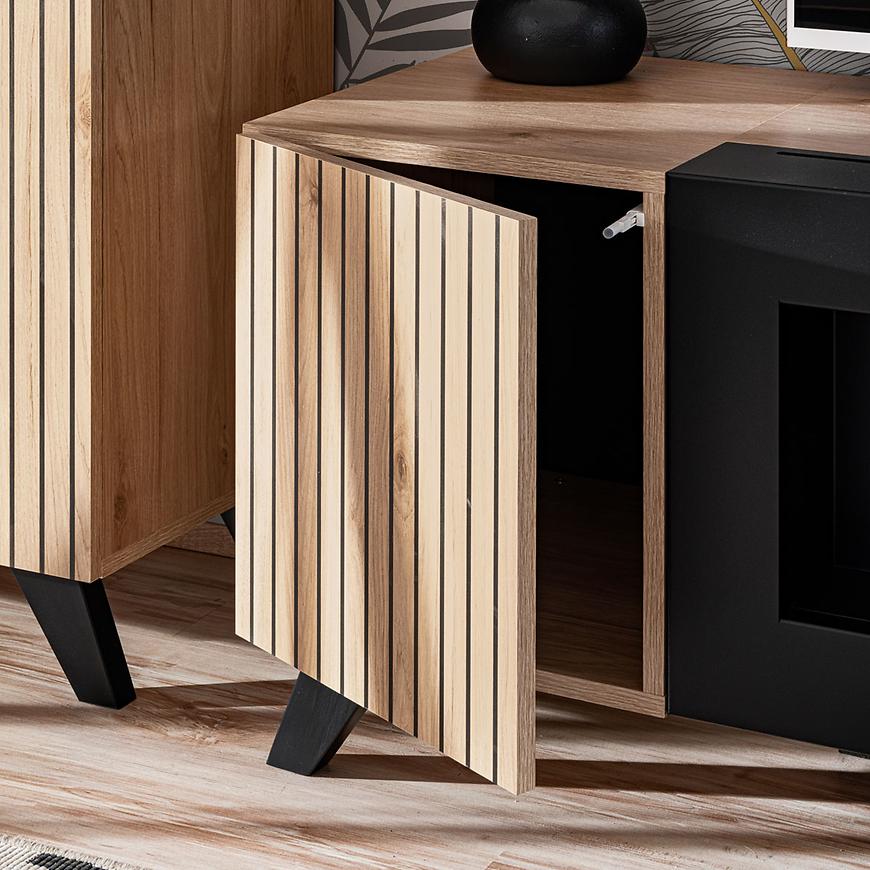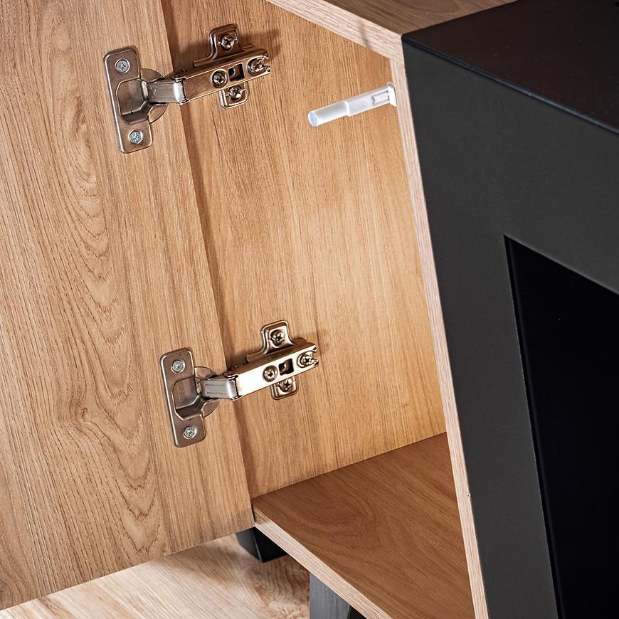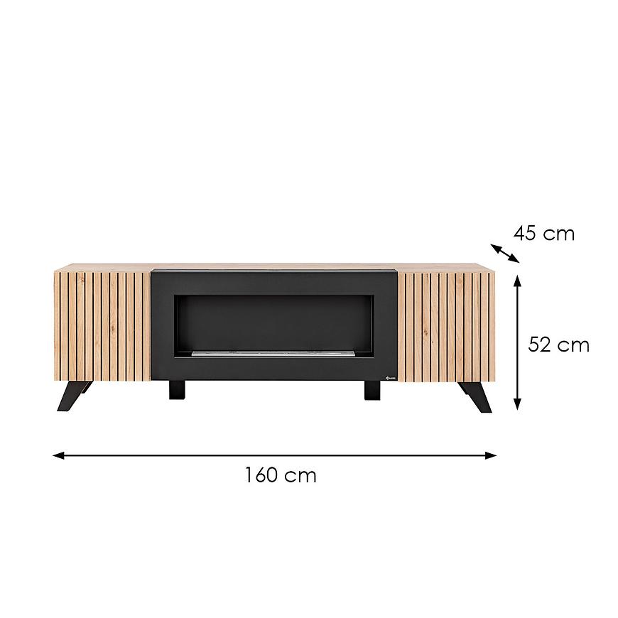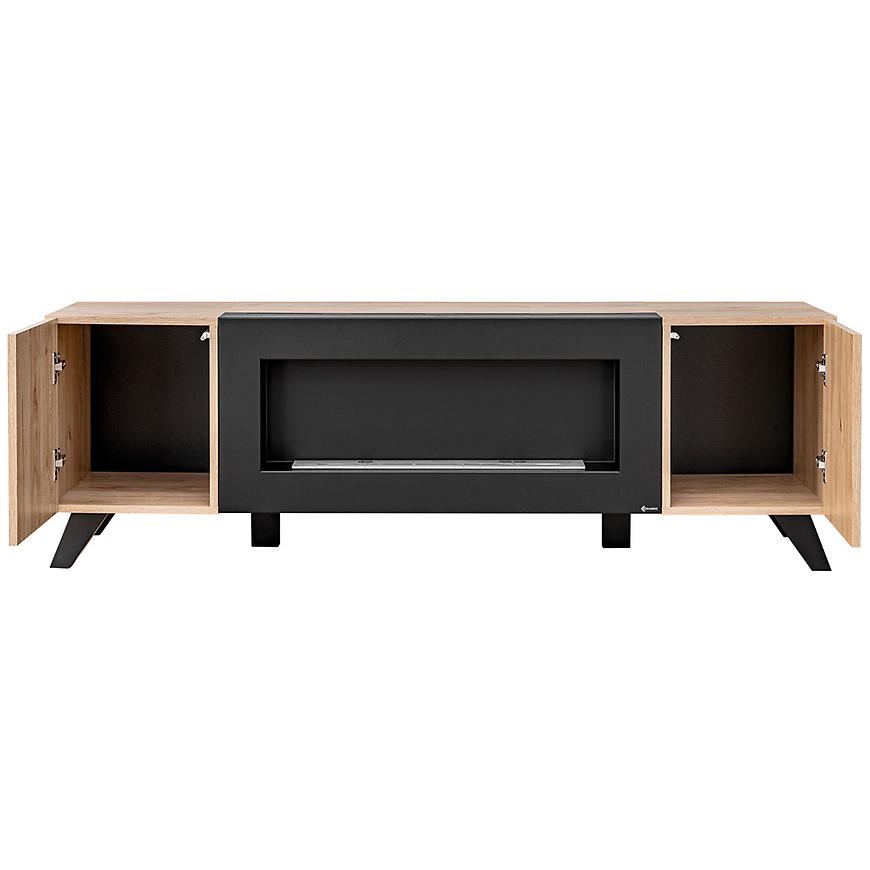 Szafka RTV-K LIAM jest wyposażona w dwoje drzwi, za każdymi z nich znajduje się jedna komora, co pozwala na przechowywanie różnych rzeczy, od sprzętu multimedialnego po dekoracje. Co wyróżnia tę szafkę, to obecność czarnego biokominka w środku, który dodaje pomieszczeniu niepowtarzalnego uroku i atmosfery.