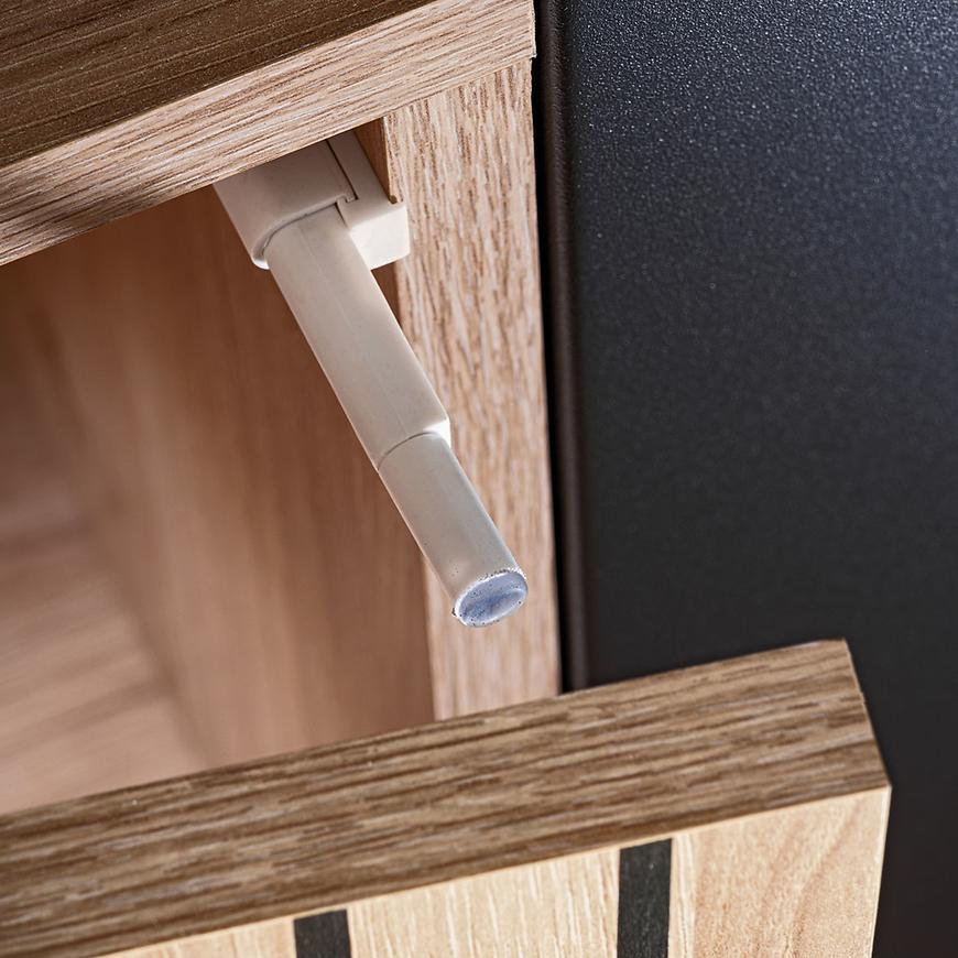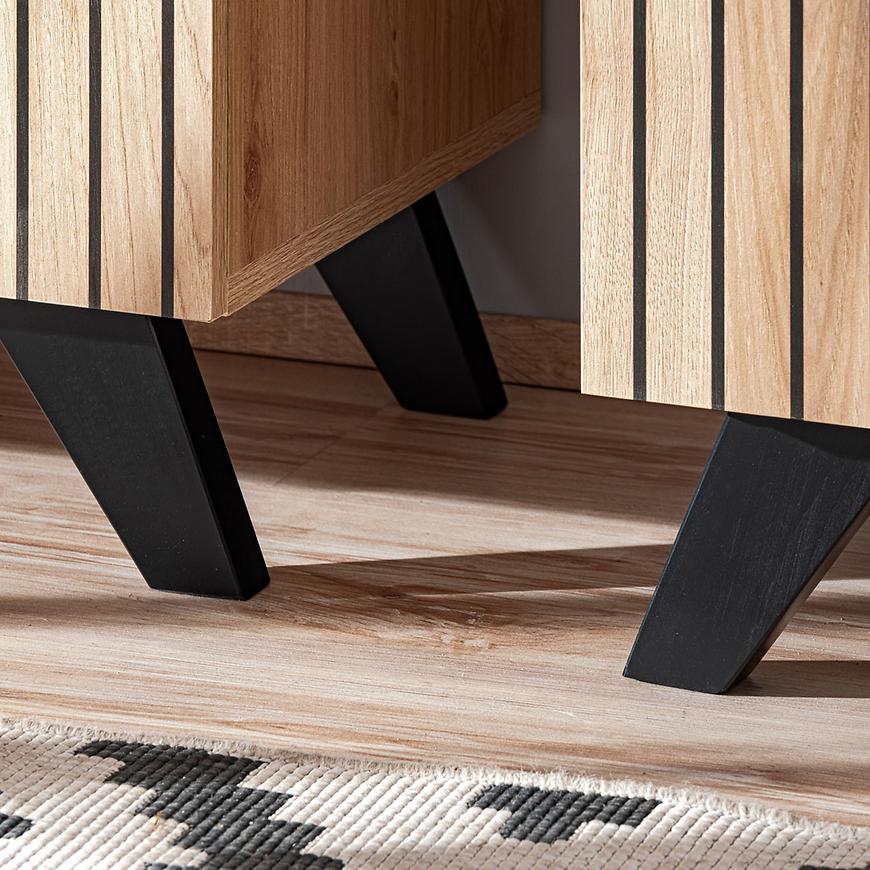 Nóżki drewniane w kolorze czarnym nadają szafce elegancji i stabilności. System push-click ułatwia otwieranie i zamykanie drzwi, co sprawia, że korzystanie z mebla jest wyjątkowo wygodne.