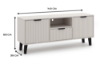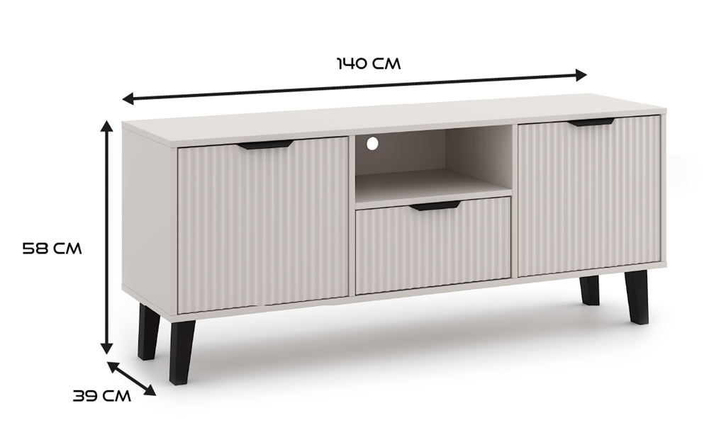 Szafka RTV Koni to idealny wybór dla miłośników prostych, ale wyrazistych aranżacji. Nowoczesna forma, ciepły odcień kaszmiru, dekoracyjne ryflowane fronty inspirowane lamelami oraz wysokie, czarne nóżki nadają meblowi lekkości i wyjątkowego charakteru. To doskonały element wyposażenia każdego salonu w stylu nowoczesnym, skandynawskim lub loftowym.