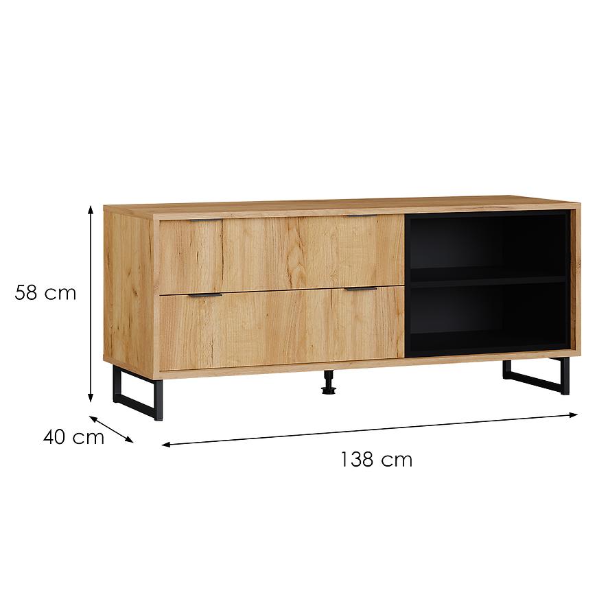 Szafka RTV Konor w kolorze Dąb Craft Złoty to stylowy mebel, który doskonale łączy naturalne wykończenie z nowoczesnym designem. Ciepły odcień drewna w dekorze dębu craft złotego wnosi do wnętrza przytulność i elegancję, a prosta, geometryczna forma z metalowymi akcentami podkreśla industrialny lub loftowy charakter aranżacji.