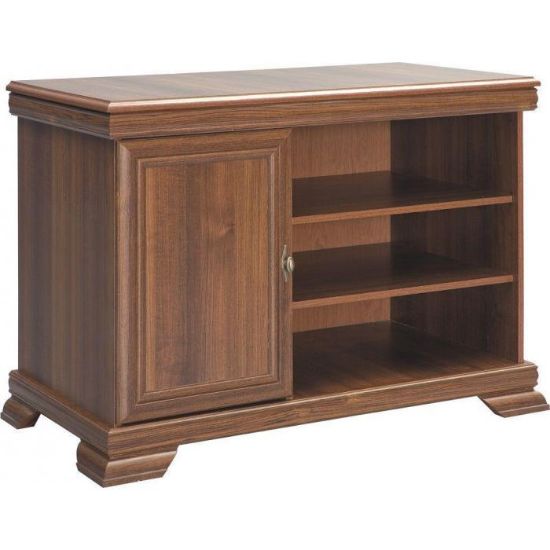 Szafka RTV Kora KRT to mebel w eleganckim, klasycznym stylu, który zamknięty został w minimalistycznej formie. Jest nie tylko świetnym uzupełnieniem designu w pomieszczeniu, ale przede wszystkim praktycznym rozwiązaniem. Styl modelu podkreśla obecność żłobień, niewielkich uchwytów oraz masywnych nóg, które jednocześnie nadają konstrukcji stabilizacji. Produkt ma podzieloną powierzchnię roboczą - oprócz blatu, znajdziemy w niej dwie półki zewnętrzne (jedną schowaną za drzwiami). Dzięki temu jesteśmy w stanie swobodnie rozmieścić sprzęt multimedialny oraz dodatkowe akcesoria telewizyjne. Szafka RTV Kora KRT sprawdzi się zarówno w eleganckich wnętrzach, jak i pomieszczeniach, gdzie zależy nam na ociepleniu atmosfery. Wszystko za sprawą harmonijnej formy, którą można zestawić z różnymi elementami wyposażenia. Dodatkowo, produkt wykonano z grubej płyty laminowanej i trwałych obrzeży, dzięki czemu wykazuje sporą odporność na uszkodzenia mechaniczne. Model objęty gwarancją producenta.