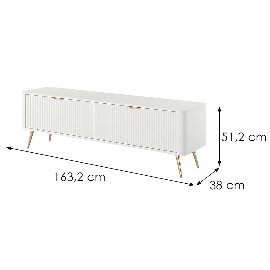 Szafka oferuje dwie przestronne komory zamykane drzwiami, które pomieszczą telewizor, konsole, odtwarzacze i inne urządzenia. Wymiary mebla – szerokość 163,2 cm, wysokość 51,2 cm i głębokość 38 cm – zapewniają wygodne ustawienie sprzętu, a jednocześnie nie zajmują nadmiernie miejsca w pomieszczeniu.