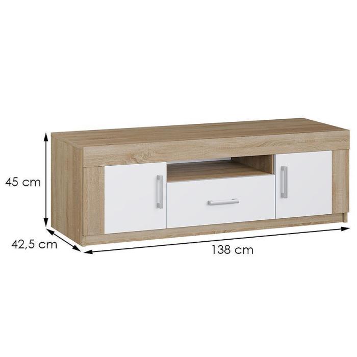 Szafka RTV posiada dwie szafki, szufladę oraz otwartą półkę. Mebel może być świetnym uzupełnieniem aranżacji w salonie i w pokoju młodzieżowym.