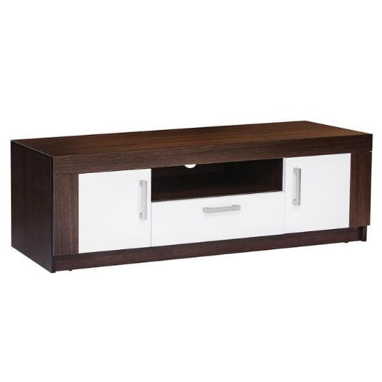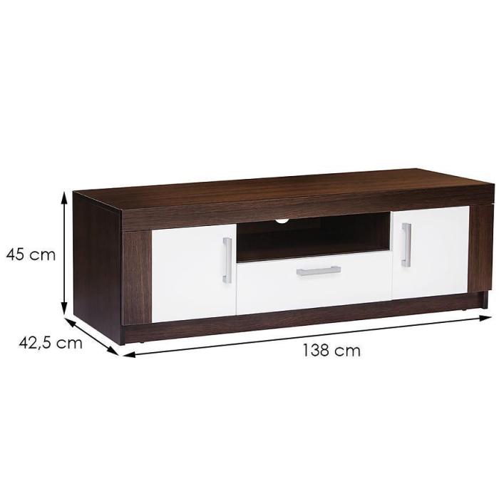 Szafka RTV posiada dwie szafki, szufladę oraz otwartą półkę. Mebel może być świetnym uzupełnieniem aranżacji w salonie i w pokoju młodzieżowym.
