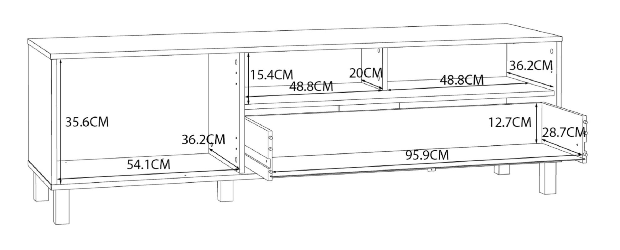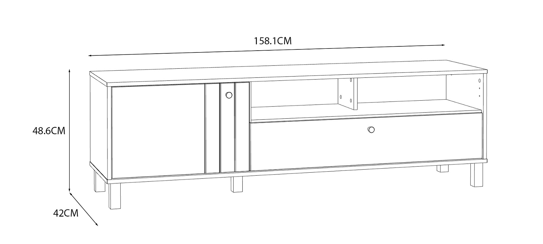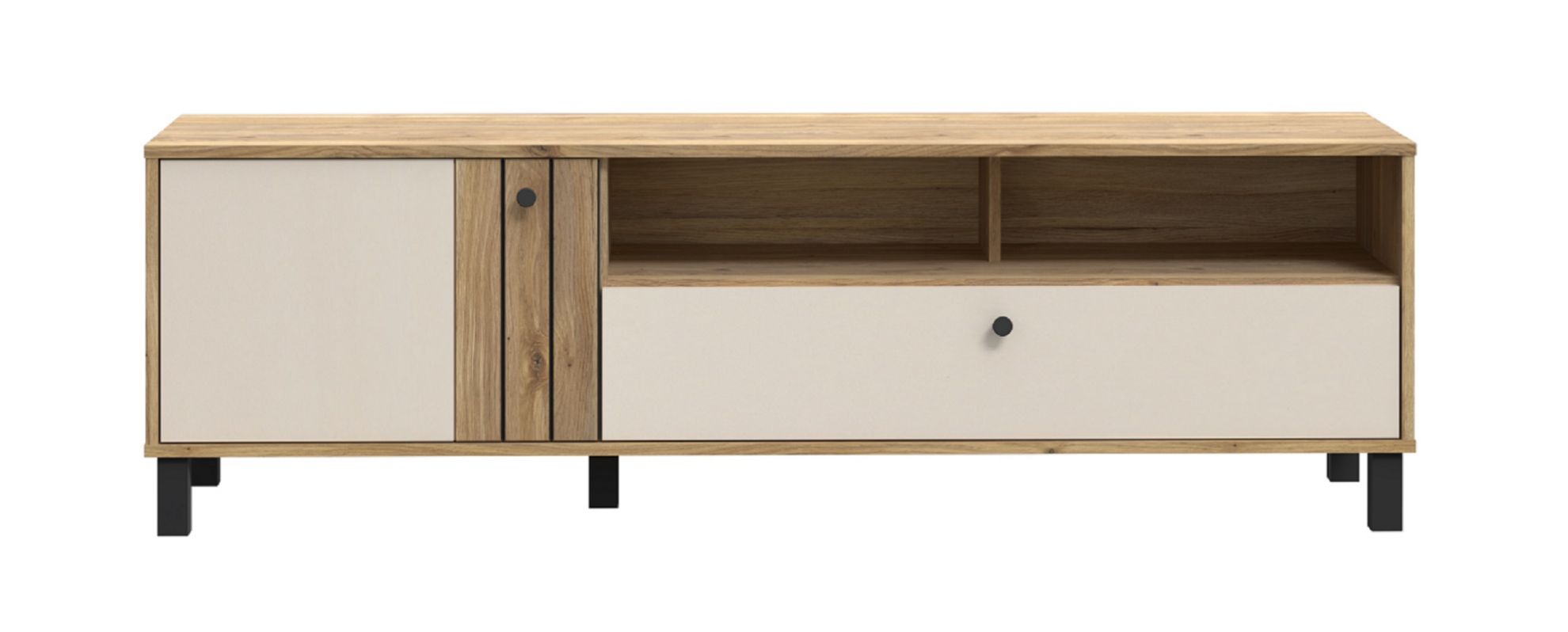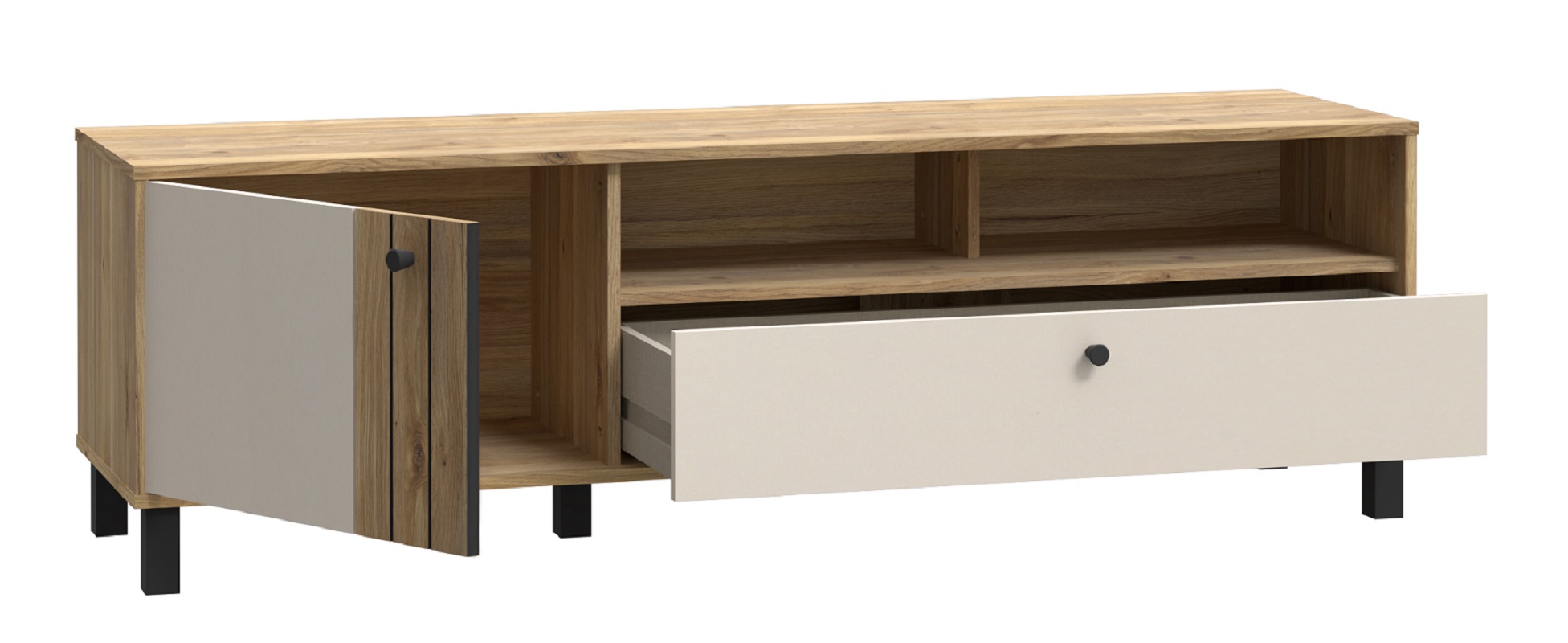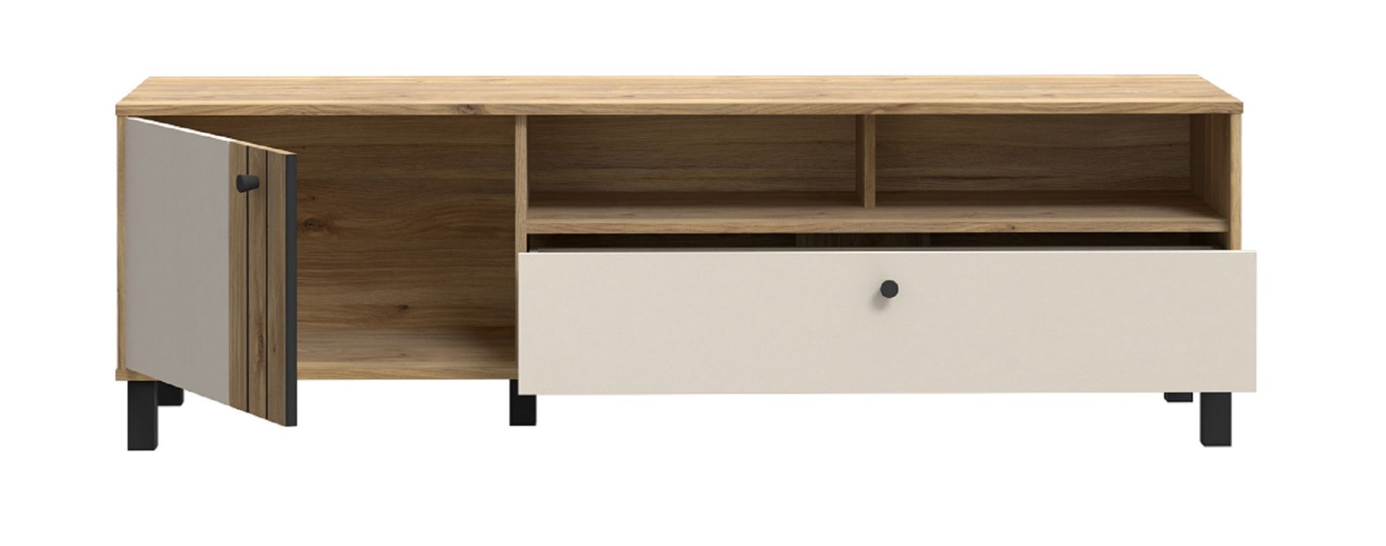 Dwie otwarte półki pozwalają na wyeksponowanie dekoracji, ulubionych książek czy sprzętu multimedialnego, tworząc stylową aranżację i nadając szafce lekkości. Szuflada umieszczona na dole to doskonałe miejsce do przechowywania drobiazgów, które chcesz mieć zawsze pod ręką.
