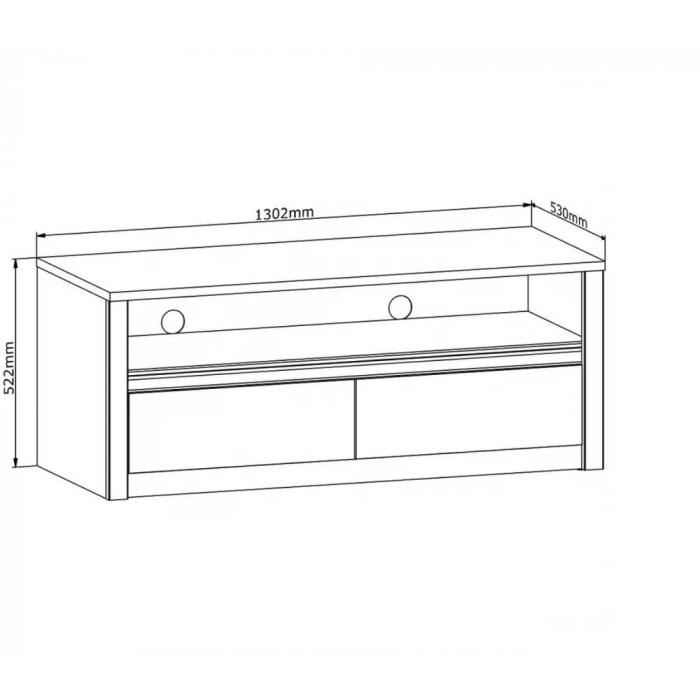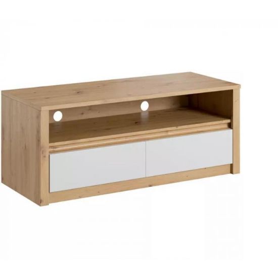 Szafka RTV pod telewizor z kolekcji Malta dostępna w kolorze korpusu dąb artisan, fronty w kolorze białym. Szafka posiada dwie praktyczne szuflady. W tylnej części znajdują się otwory na przewody. Szuflady wyposażone w metalowe, kulkowe prowadnice z pełnym wysuwem. Szafka wykonana z płyty laminowanej, odpornej na uszkodzenia. Szafka RTV Malta posiada system bezuchwytowy. Produkt w paczkach do samodzielnego montażu.