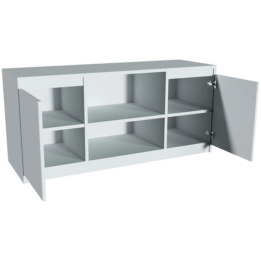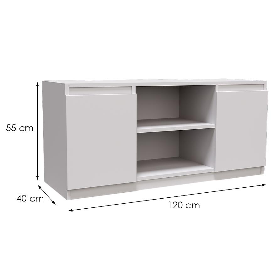 Szafka RTV Merg biały to funkcjonalny i elegancki mebel o wymiarach 120 cm szerokości, 55 cm wysokości i 40 cm głębokości, który pozwala na wygodne ustawienie sprzętu multimedialnego w pomieszczeniu. Posiada dwa drzwi, które kryją przestronne wnętrze, idealne do przechowywania sprzętu RTV, akcesoriów lub innych przedmiotów, zachowując porządek i estetykę wnętrza. Szafka wykonana jest z wytrzymałej płyty wiórowej laminowanej w białym, matowym wykończeniu, co nadaje meblowi nowoczesny, minimalistyczny wygląd i ułatwia dopasowanie do różnych aranżacji. Mebel waży 29 kg i wymaga samodzielnego złożenia, co ułatwia transport i ustawienie w wybranej przestrzeni. Stylowa, praktyczna i trwała, szafka RTV Merg łączy funkcjonalność z estetyką, tworząc centralny punkt w każdym pomieszczeniu.