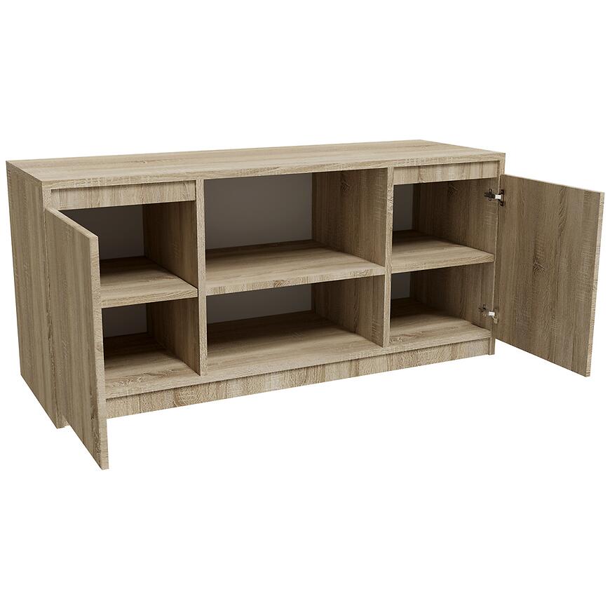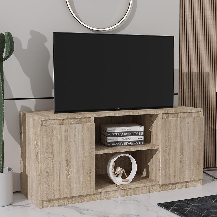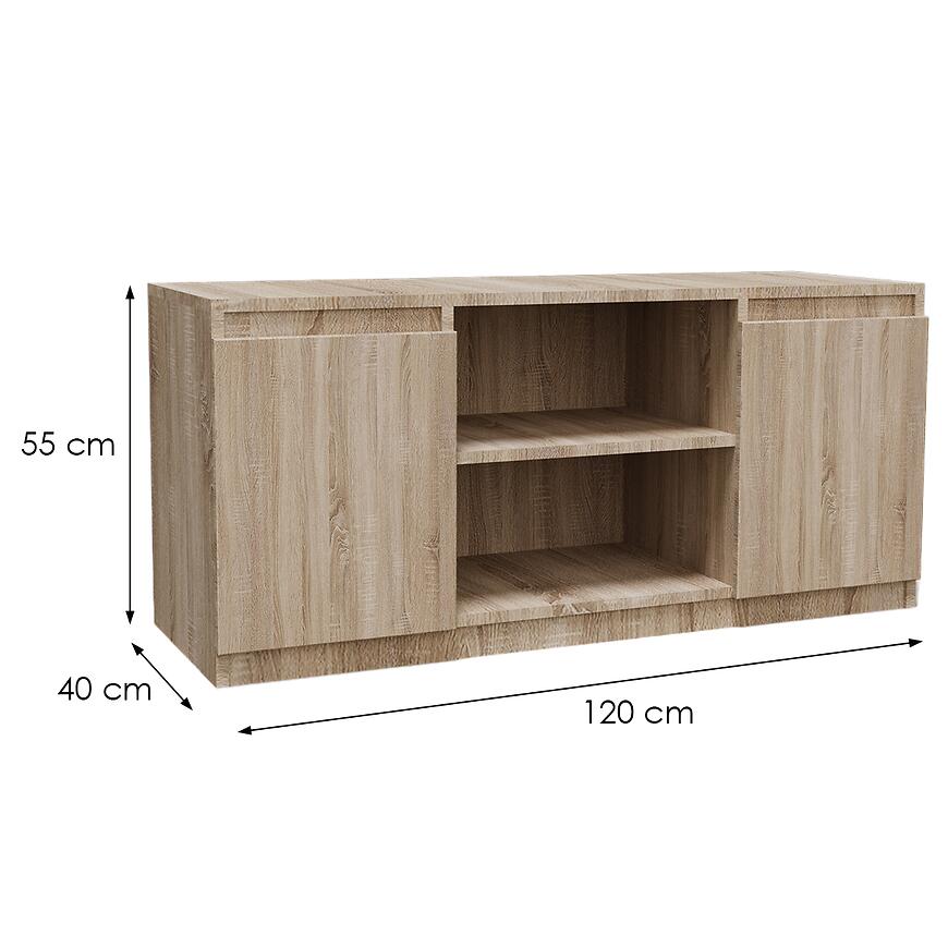 Szafka RTV Merg sonoma to praktyczny i nowoczesny mebel o wymiarach 120 cm szerokości, 55 cm wysokości i 40 cm głębokości, który doskonale sprawdzi się do przechowywania sprzętu RTV i akcesoriów. Wyposażona w dwa drzwi, oferuje przestronne wnętrze, pozwalające utrzymać porządek i estetykę w pomieszczeniu. Szafka wykonana jest z trwałej płyty wiórowej laminowanej w wybarwieniu jasne drewnopodobne sonoma z matowym wykończeniem frontów i korpusu, co nadaje jej naturalny, elegancki wygląd i umożliwia łatwe dopasowanie do różnych stylów aranżacji. Mebel waży 29 kg i wymaga samodzielnego złożenia, co ułatwia transport i ustawienie. Stylowa, funkcjonalna i solidna, szafka RTV Merg sonoma łączy estetykę drewna z praktycznym zastosowaniem, stanowiąc elegancki element wyposażenia wnętrza.