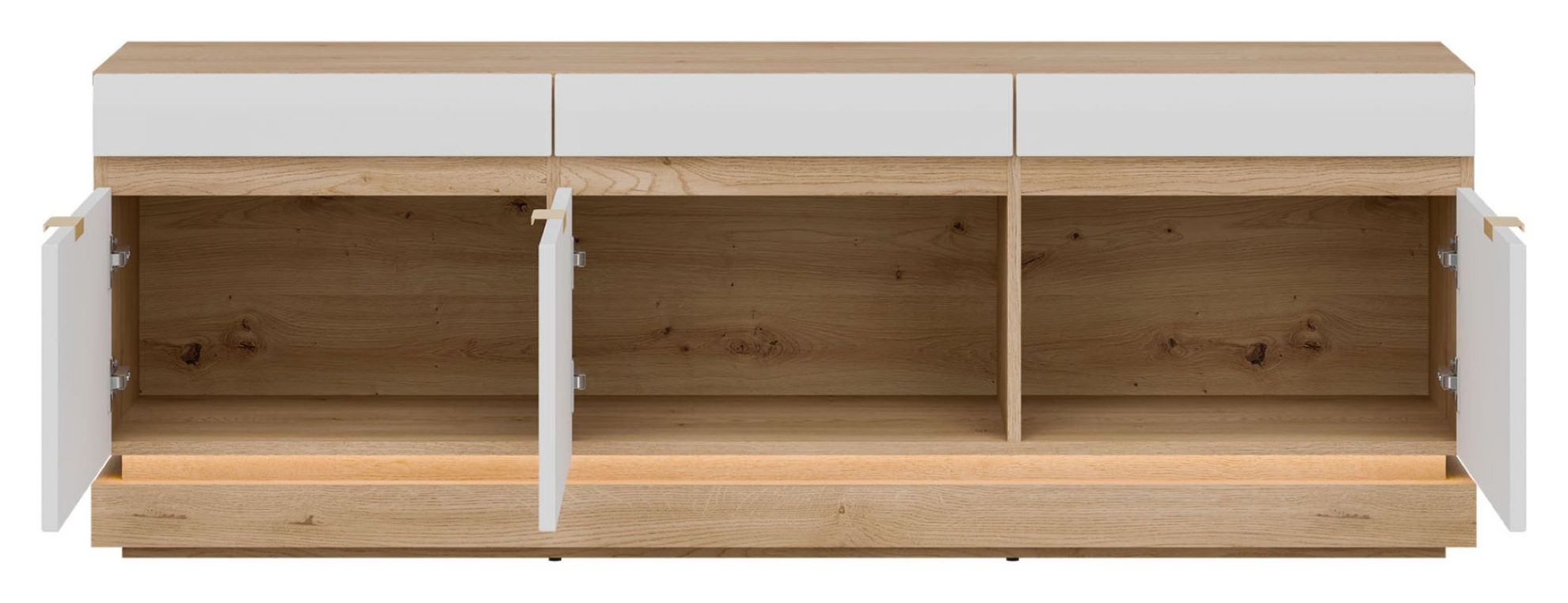 Opcjonalne oświetlenie LED, dostępne m.in. w przeszklonych witrynach, nie tylko eksponuje zawartość mebli, ale także tworzy nastrojową atmosferę, idealną do wieczornego relaksu. Dyskretne podświetlenie podkreśla nowoczesny charakter kolekcji i dodaje wnętrzom przytulności.