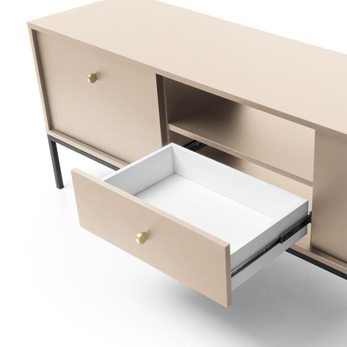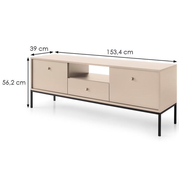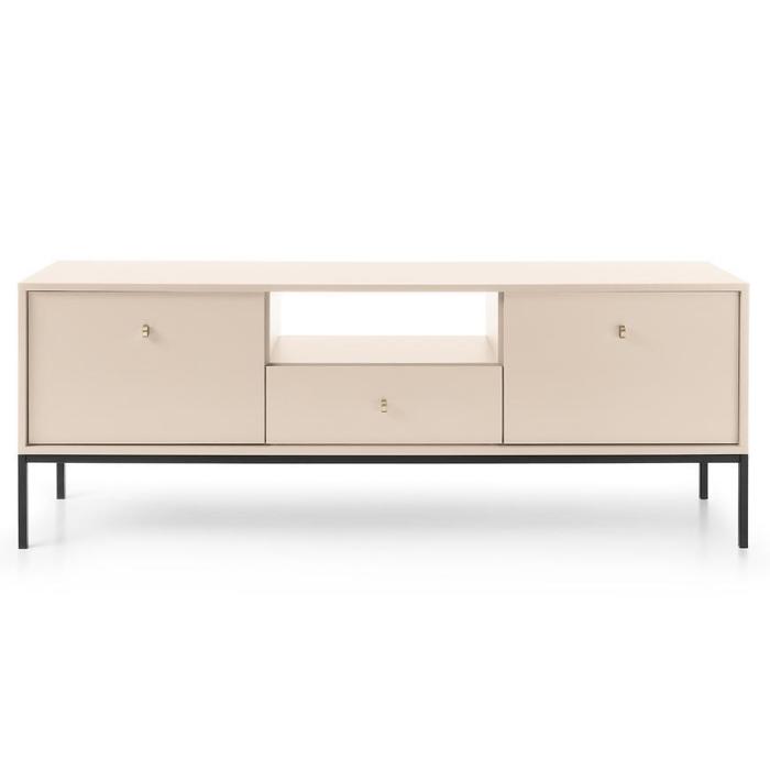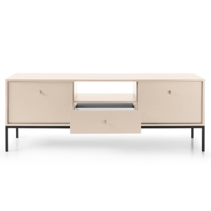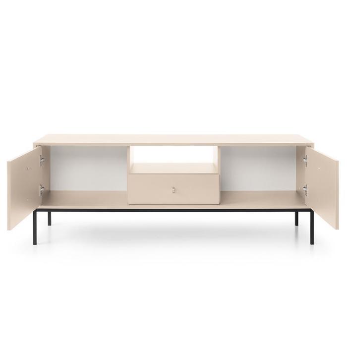 Szafka RTV Mono w kolorze beżowym świetnie prezentuje się we wnętrzach w stylu loftowym. Doskonale sprawdzi się w każdym salonie lub innym, dowolnym pomieszczeniu. Wykonana jest z płyty wiórowej laminowanej o solidnej i trwałej konstrukcji.