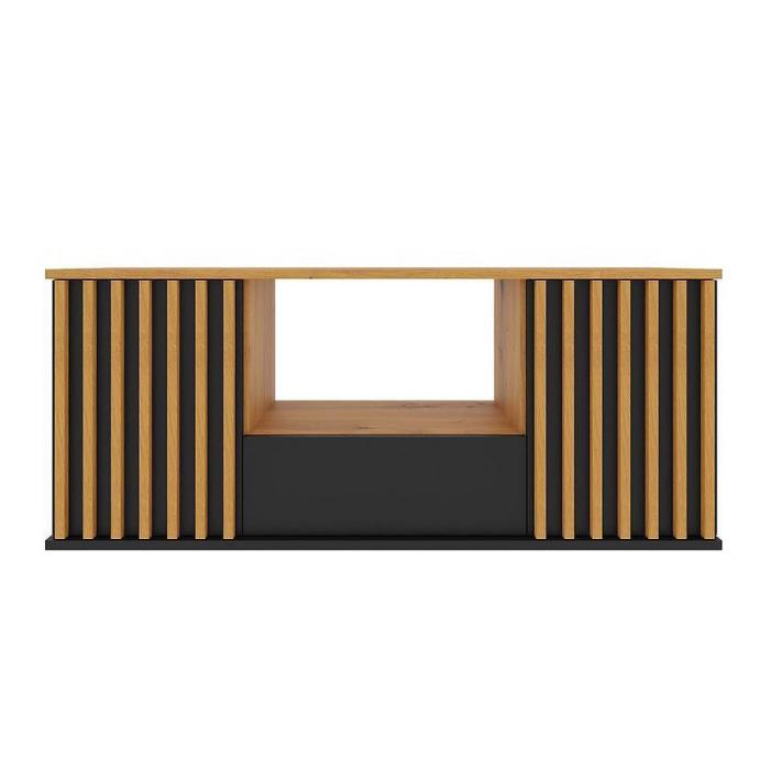 Meble z kolekcji Nairobi zostały wykonane z wysokiej jakości płyty wiórowej laminowanej, co gwarantuje trwałość i odporność na uszkodzenia. Połączenie dekoru dąb artisan z elementami w czarnym kolorze oraz ozdobnymi lamelkami nadaje tym meblom niepowtarzalnego charakteru. To połączenie naturalnej elegancji drewna dębowego z nowoczesnymi, czarnymi akcentami.