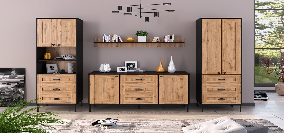 Loftowa, minimalistyczna kolekcja Henry to meble dedykowane do pokoju dziennego. Uniwersalna kolorystyka pozwoli na spójną aranżację każdego wnętrza. Meble nie tylko świetnie wpiszą się w aranżację pokoju dziennego, ale także mogą być świetnym uzupełnieniem salonu czy sypialni.