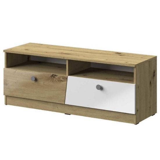 Szafka RTV Nero to mebel o nowoczesnym i ciekawym designie. Dzięki połączeniu kolorów, wpasuje się w wiele aranżacji, nadając tym samym efektowny wygląd pomieszczeniu. Posiada dwie szuflady oraz dwie półki. Szafka została wykonana z płyty wiórowej laminowanej.