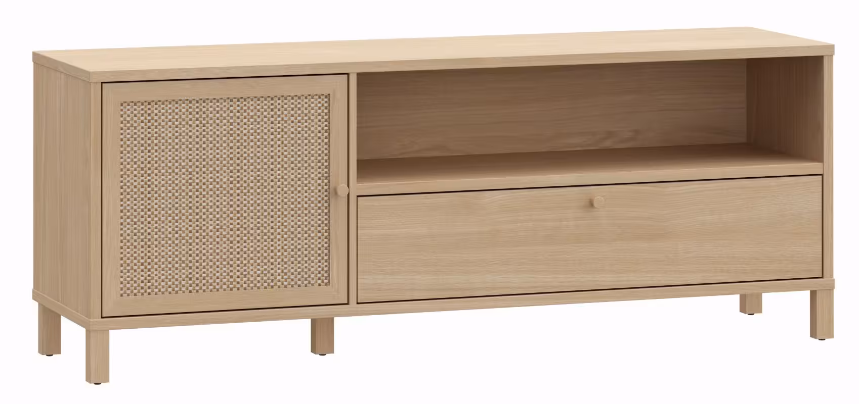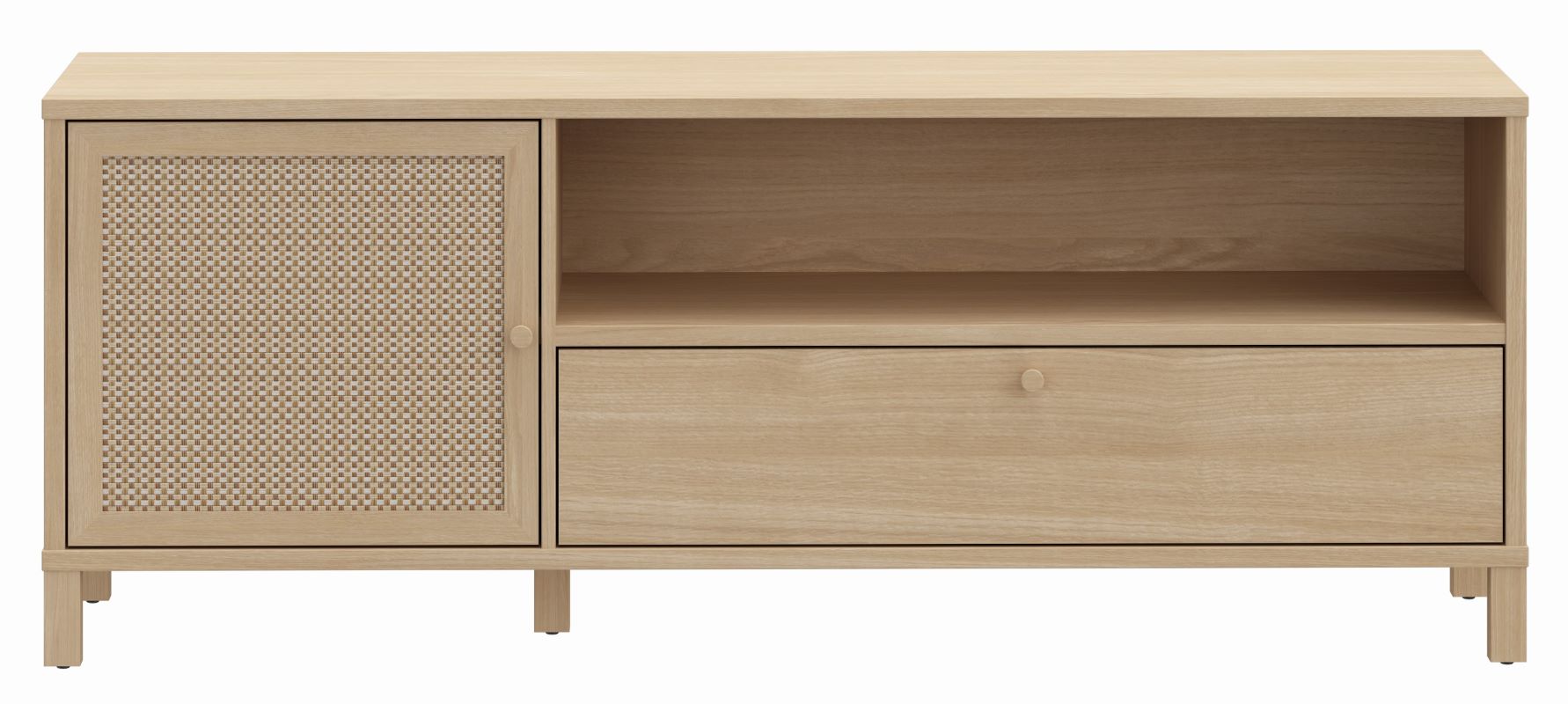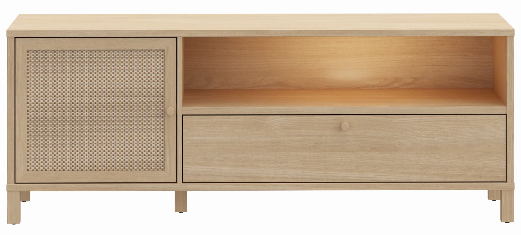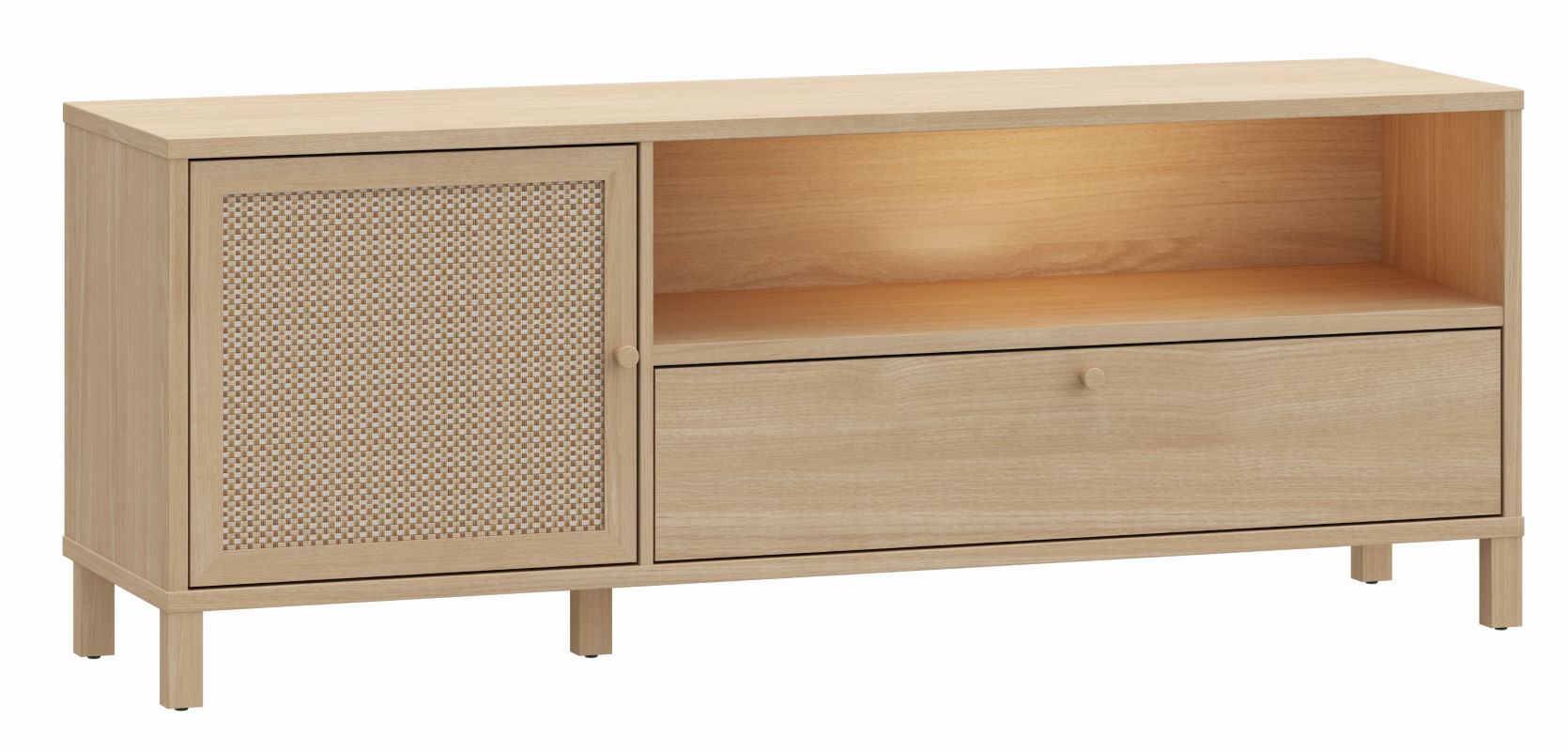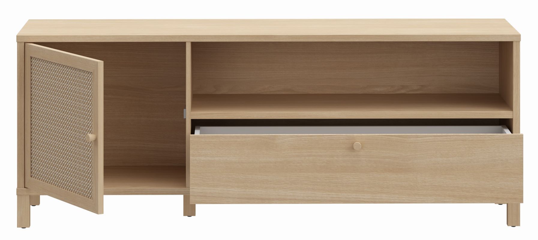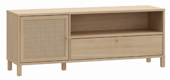 Szafka RTV Nortado to elegancki mebel, który doskonale wpisuje się w nowoczesne wnętrza, łącząc funkcjonalność z ponadczasowym stylem. Wykonana z płyty meblowej o wysokiej odporności na uszkodzenia, szafka charakteryzuje się wyjątkową trwałością i estetyką. Jej korpus w dekorze dąb elegancja wprowadza do wnętrza naturalny, ciepły klimat, a rattanowe panele na drzwiczkach stanowią subtelną dekorację, która dodaje meblowi lekkości i oryginalności. Szafka wyposażona jest w jedne drzwi, szufladę i półkę, a zastosowane prowadnice z pełnym wysunięciem oraz cichy domyk zapewniają komfort użytkowania, eliminując hałas podczas zamykania frontów.