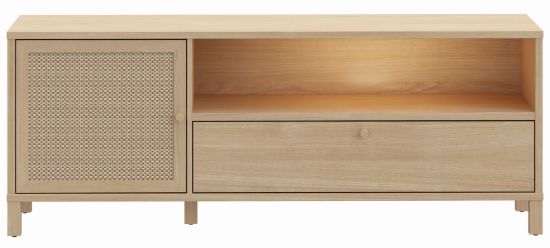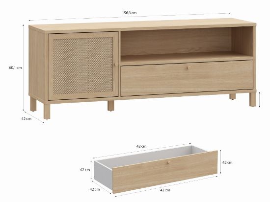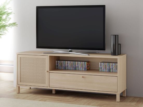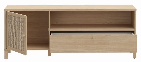 Szafka RTV Nortado to elegancki mebel, który doskonale wpisuje się w nowoczesne wnętrza, łącząc funkcjonalność z ponadczasowym stylem. Wykonana z płyty meblowej o wysokiej odporności na uszkodzenia, szafka charakteryzuje się wyjątkową trwałością i estetyką. Jej korpus w dekorze dąb elegancja wprowadza do wnętrza naturalny, ciepły klimat, a rattanowe panele na drzwiczkach stanowią subtelną dekorację, która dodaje meblowi lekkości i oryginalności. Szafka wyposażona jest w jedne drzwi, szufladę i półkę, a zastosowane prowadnice z pełnym wysunięciem oraz cichy domyk zapewniają komfort użytkowania, eliminując hałas podczas zamykania frontów.