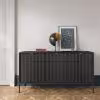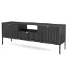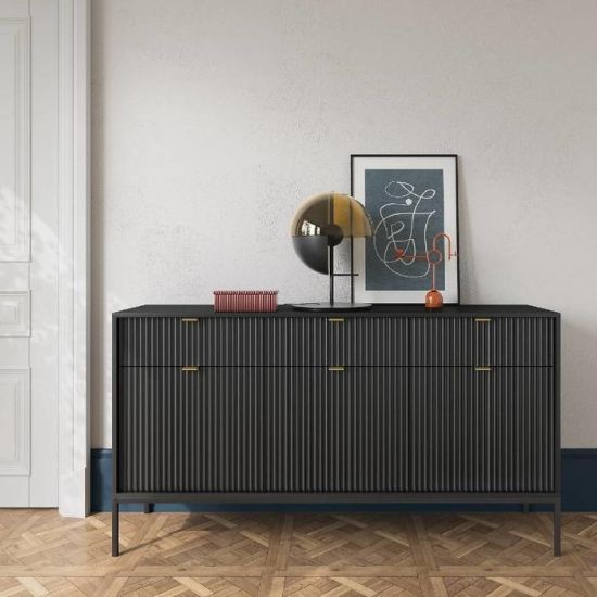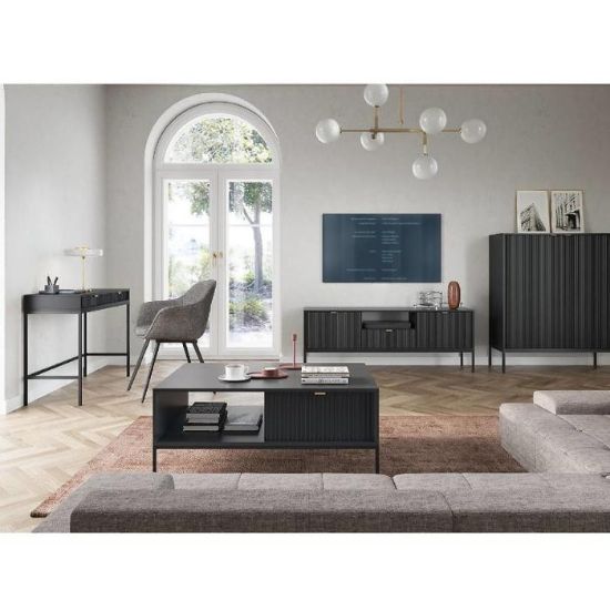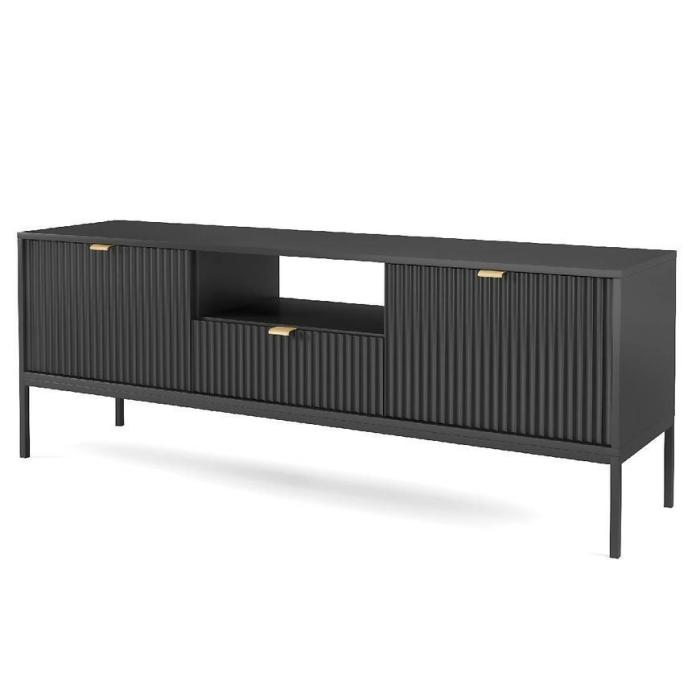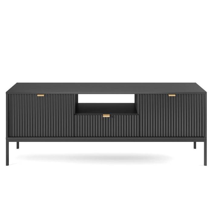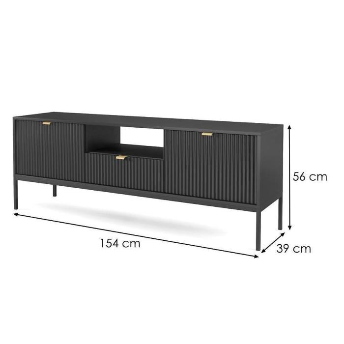 Szafka RTV Nova 154 czarny to propozycja dla osób, które poszukują eleganckiego i praktycznego mebla do salonu. Minimalistyczny design w całkowicie czarnym wykończeniu doskonale komponuje się z nowoczesnymi aranżacjami wnętrz, a jednocześnie wprowadza do przestrzeni styl i harmonię. Matowe fronty wykonane z płyty MDF podkreślają nowoczesny charakter szafki, a korpus z płyty wiórowej laminowanej zapewnia stabilność i trwałość mebla.