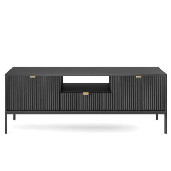Szafka RTV Nova 154 wyróżnia się eleganckim, czarnym wykończeniem, które sprawia, że mebel staje się subtelnym, a zarazem efektownym elementem salonu. Matowe fronty i korpus nie odbijają światła, dzięki czemu szafka zachowuje estetyczny wygląd przez długi czas. Nowoczesny design sprawia, że szafka doskonale wpasowuje się zarówno w minimalistyczne, skandynawskie, jak i loftowe wnętrza.