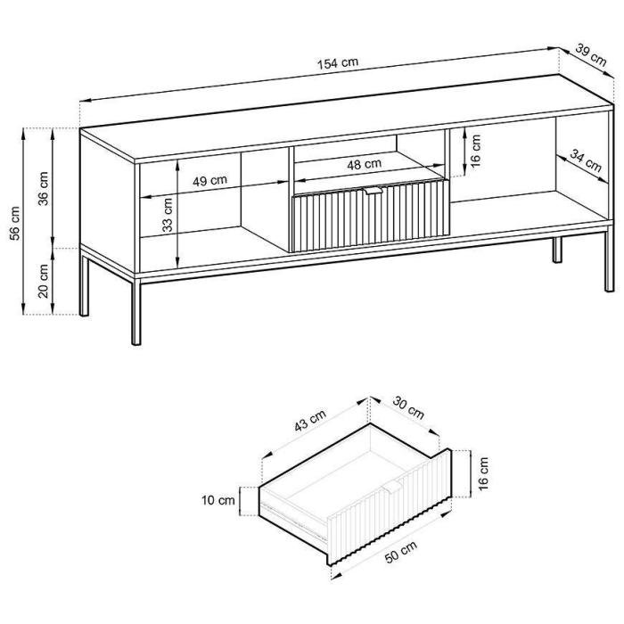 Szafka RTV Nova 154 została wyposażona w dwie drzwiczki, jedną szufladę i półkę. Drzwiczki kryją przestrzeń do przechowywania urządzeń RTV, konsol, pilotów oraz innych akcesoriów, pozwalając utrzymać porządek w salonie. Szuflada umożliwia wygodne przechowywanie drobnych przedmiotów, natomiast półka zapewnia miejsce na dodatkowy sprzęt lub dekoracje. Dzięki takiemu układowi wszystko jest zawsze pod ręką, a salon pozostaje uporządkowany.