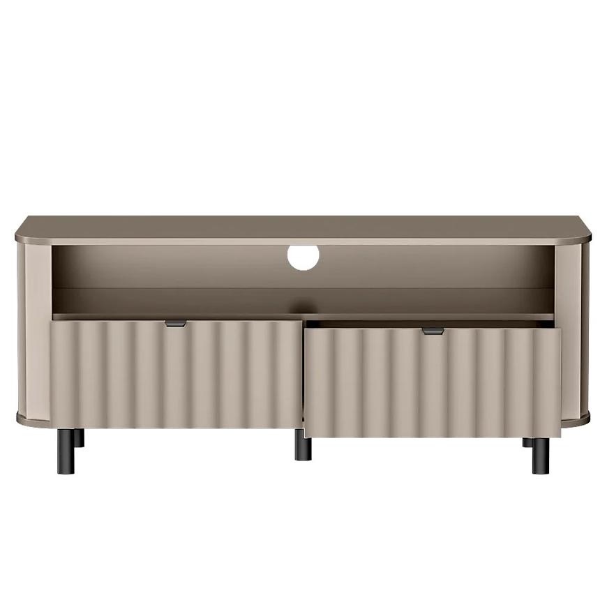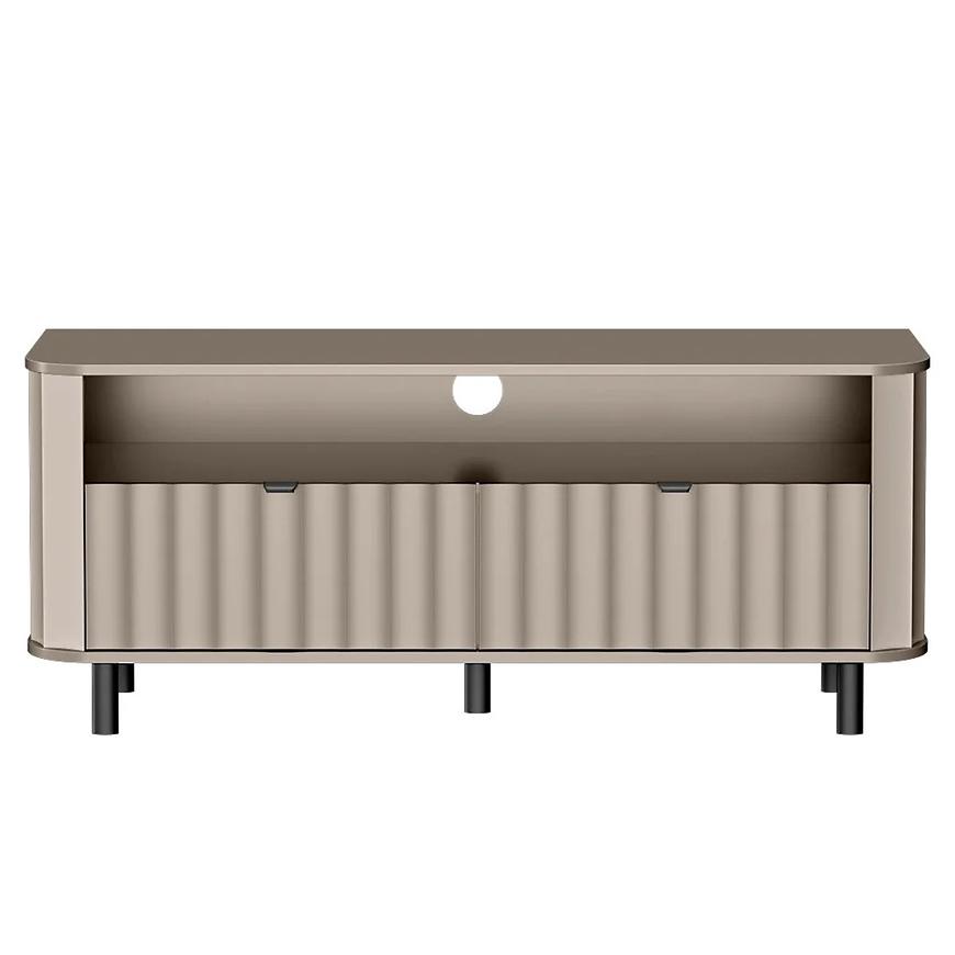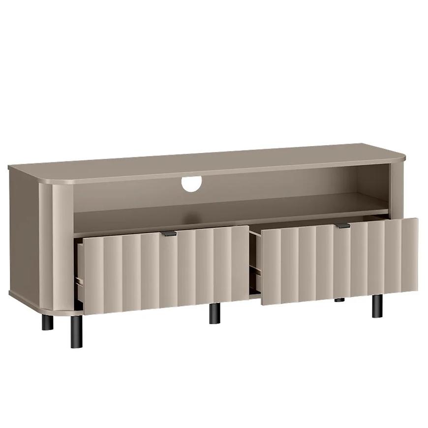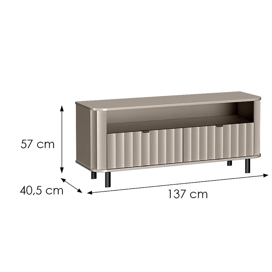 Szafka RTV Novado 6NV 140 Clay Gray to nowoczesny mebel o wymiarach 57x137x40,5 cm, wykonany z płyty MDF i laminowanej płyty wiórowej w eleganckim, szarym kolorze clay gray z matowym wykończeniem. Wyposażona w dwie praktyczne szuflady, doskonale sprawdzi się w minimalistycznych wnętrzach. Szafka wymaga złożenia, łącząc funkcjonalność z nowoczesnym designem.