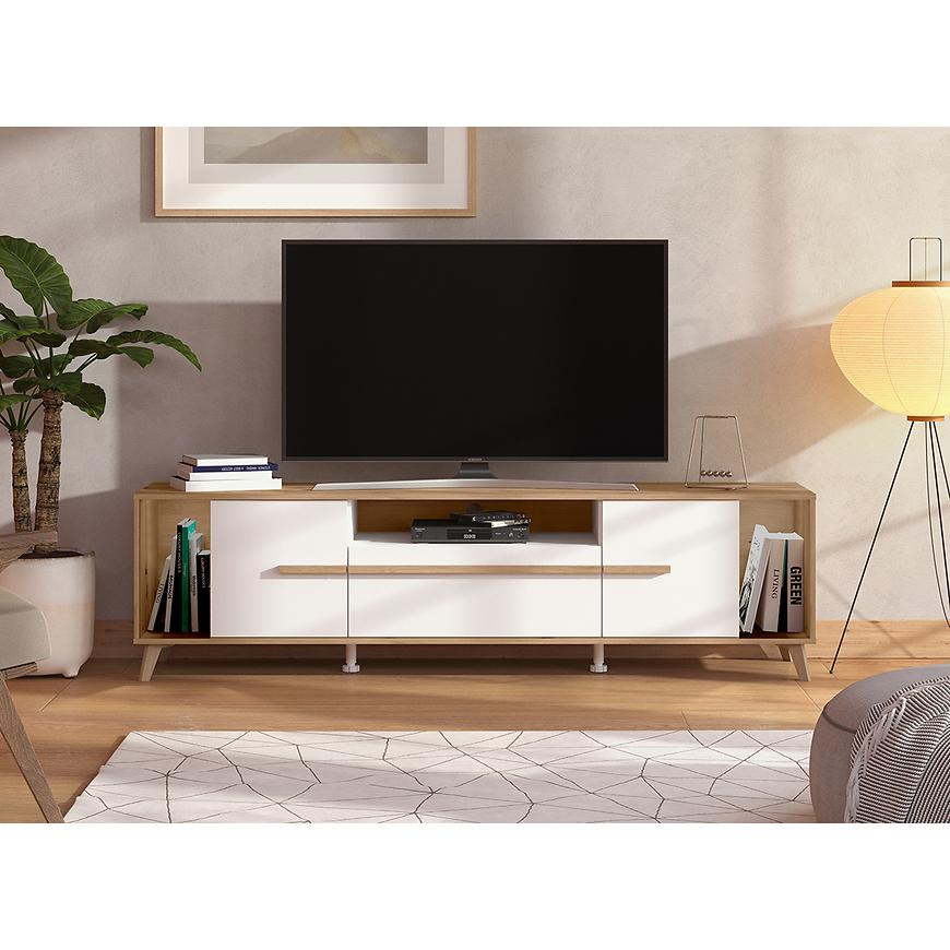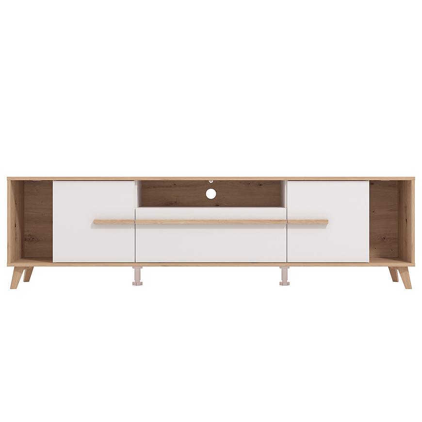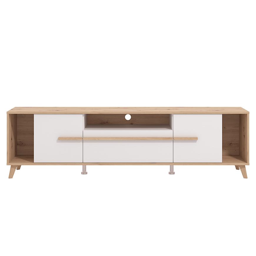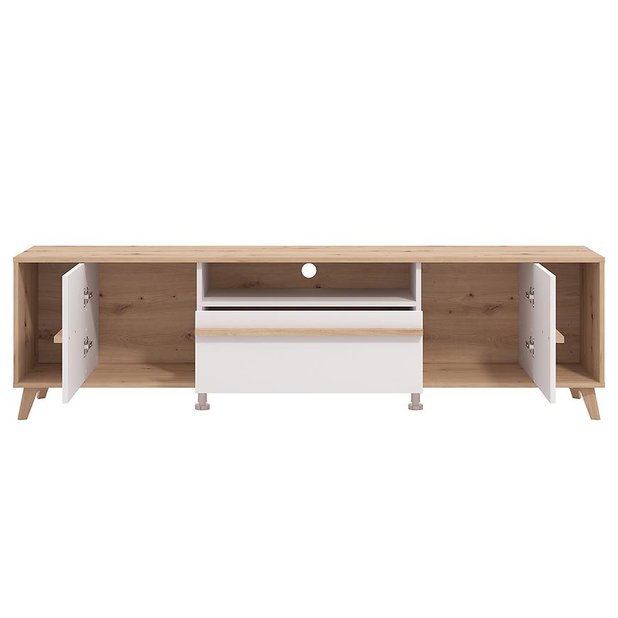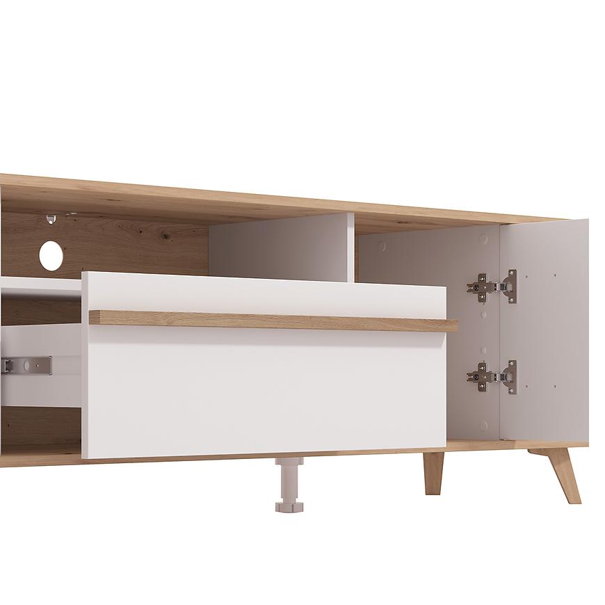 Szafka RTV Orleans w połączeniu białych frontów z korpusem w dekorze dąb artisan to nowoczesny mebel o lekkim, eleganckim wyglądzie. Matowe wykończenie nadaje całości stonowany charakter, a kontrast kolorystyczny podkreśla estetykę i nowoczesny styl.