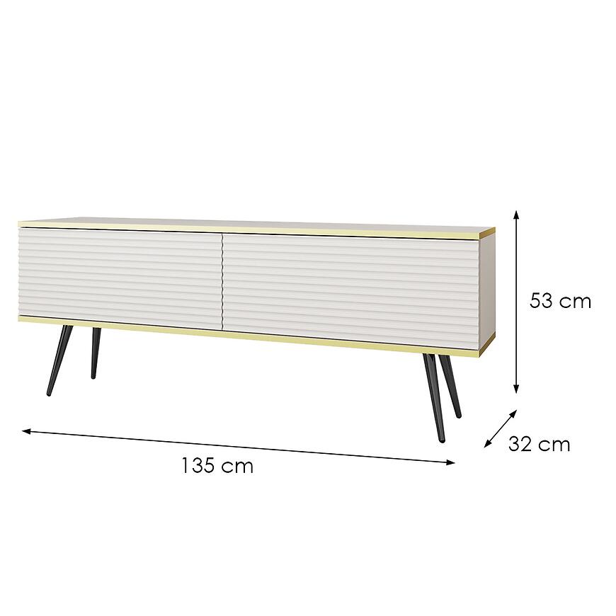 Szafka RTV Oro MDF Ryfla 135 Biały z czarnymi nogami to nowoczesny mebel łączący elegancję, funkcjonalność i solidne wykonanie. Fronty wykonane z płyty MDF, a korpus z laminowanej płyty wiórowej w matowym wykończeniu, zapewniają trwałość i stylowy wygląd. Dwudrzwiowa konstrukcja oferuje praktyczną przestrzeń do przechowywania sprzętu RTV i akcesoriów, a czarne nogi nadają szafce nowoczesny, wyrazisty charakter. Kompaktowe wymiary (53×135×32 cm) sprawiają, że mebel idealnie pasuje do różnych wnętrz, łącząc estetykę, funkcjonalność i wytrzymałość w jednym eleganckim elemencie wyposażenia.