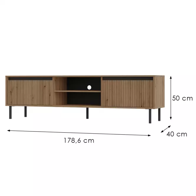 Szafka Osaka 312 2S oferuje wystarczająco dużo przestrzeni do przechowywania sprzętu RTV, płaskich telewizorów, konsol do gier oraz innych urządzeń multimedialnych. Została wyposażona w dwie pojemne szuflady oraz półki, które umożliwiają przechowywanie kabli, pilotów oraz innych akcesoriów w sposób zorganizowany i estetyczny. Dzięki temu, nie tylko pełni rolę mebla do przechowywania, ale także pomaga utrzymać porządek w strefie multimedialnej.