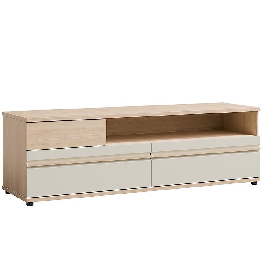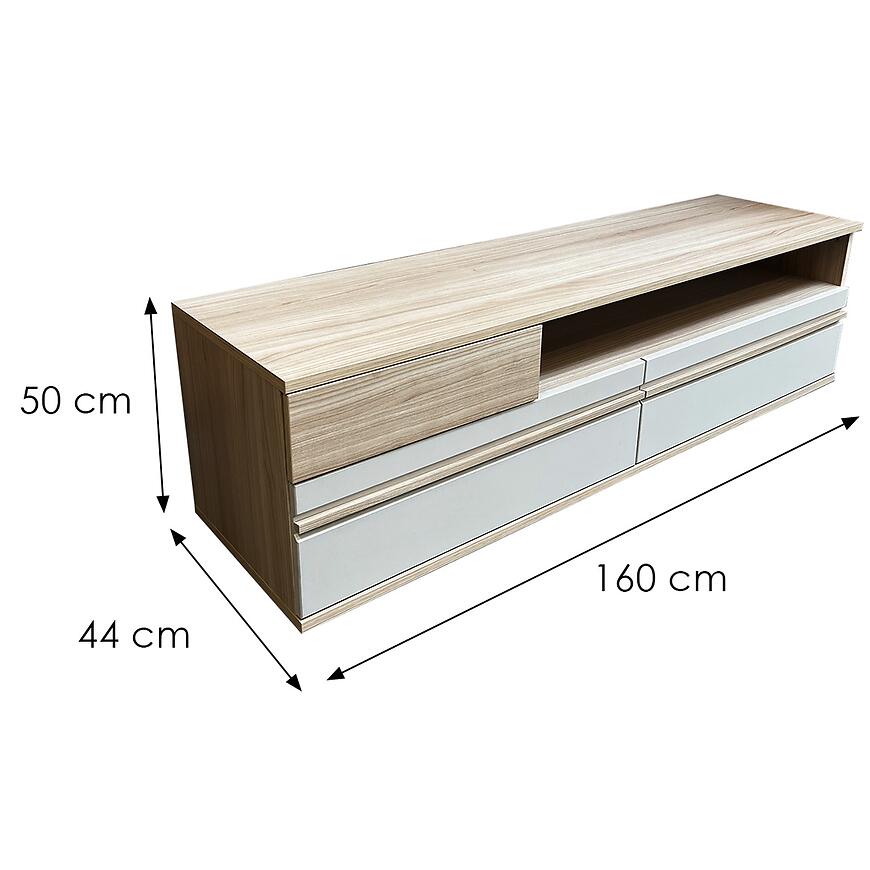 Szafka wyposażona jest w trzy pojemne szuflady, które pozwalają na wygodne przechowywanie sprzętu RTV, pilotów, kabli czy innych drobnych przedmiotów. Dzięki temu wszystkie akcesoria są uporządkowane i zawsze pod ręką, co zwiększa komfort codziennego użytkowania.