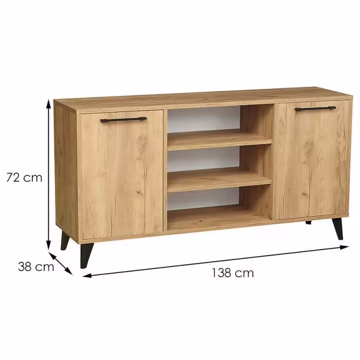 Szafka RTV posiada dwie szafki oraz otwarte półki. Mebel może być świetnym uzupełnieniem aranżacji w salonie i w pokoju młodzieżowym.