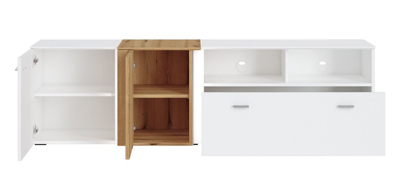 Zalety szafki RTV Cambria to nie tylko jej estetyczny wygląd, ale także funkcjonalność i trwałość. Jej solidna konstrukcja i wysokiej jakości materiały gwarantują długotrwałe użytkowanie oraz łatwość utrzymania w czystości. To doskonały wybór dla osób ceniących sobie piękno, praktyczność i wygodę w jednym meblu.