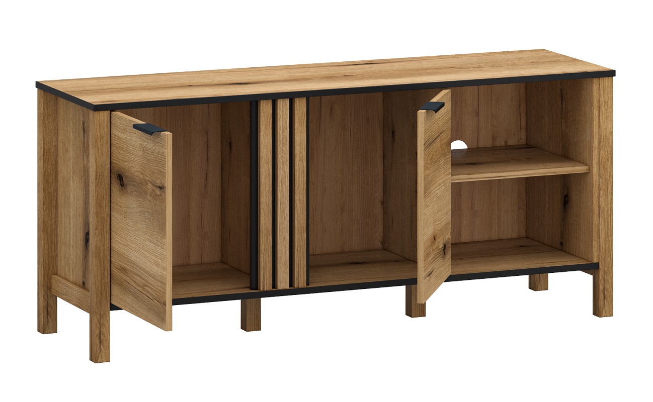 Wnętrze szafki RTV Helios 2 zostało zaprojektowane z myślą o praktyczności. Znajduje się w nim jedna półka, idealna na urządzenia multimedialne, dekodery czy konsolki, umożliwiając jednocześnie schludne uporządkowanie przestrzeni.