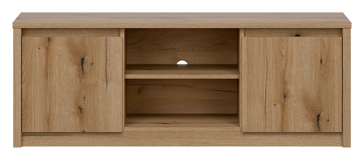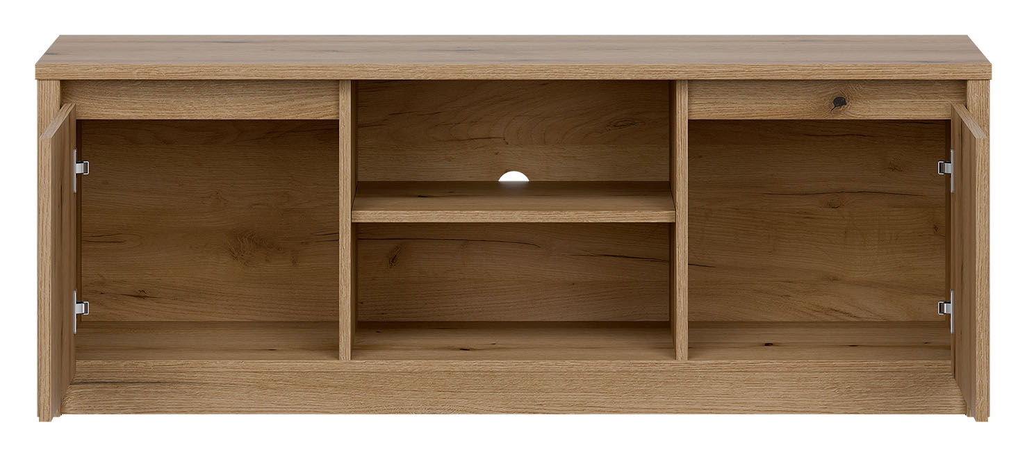 Dwudrzwiowa konstrukcja tej szafki nie tylko zapewnia estetyczny wygląd, ale także praktyczne rozwiązania organizacyjne. W centralnej części znajduje się jedna półka, dzięki której możesz swobodnie przechowywać różnorodne urządzenia multimedialne, piloty czy inne niezbędne akcesoria. To idealne miejsce na umieszczenie dekodera, konsoli do gier, czy też kolekcji ulubionych filmów.