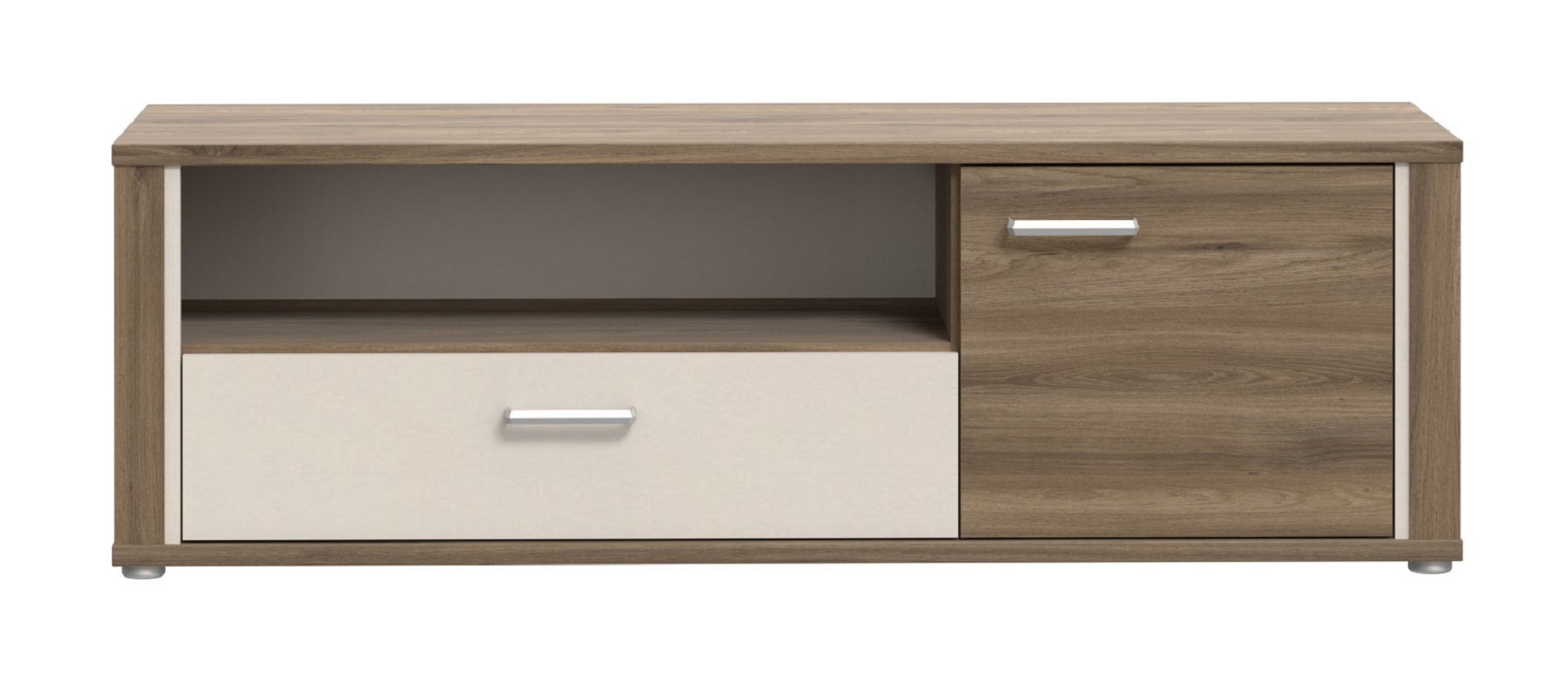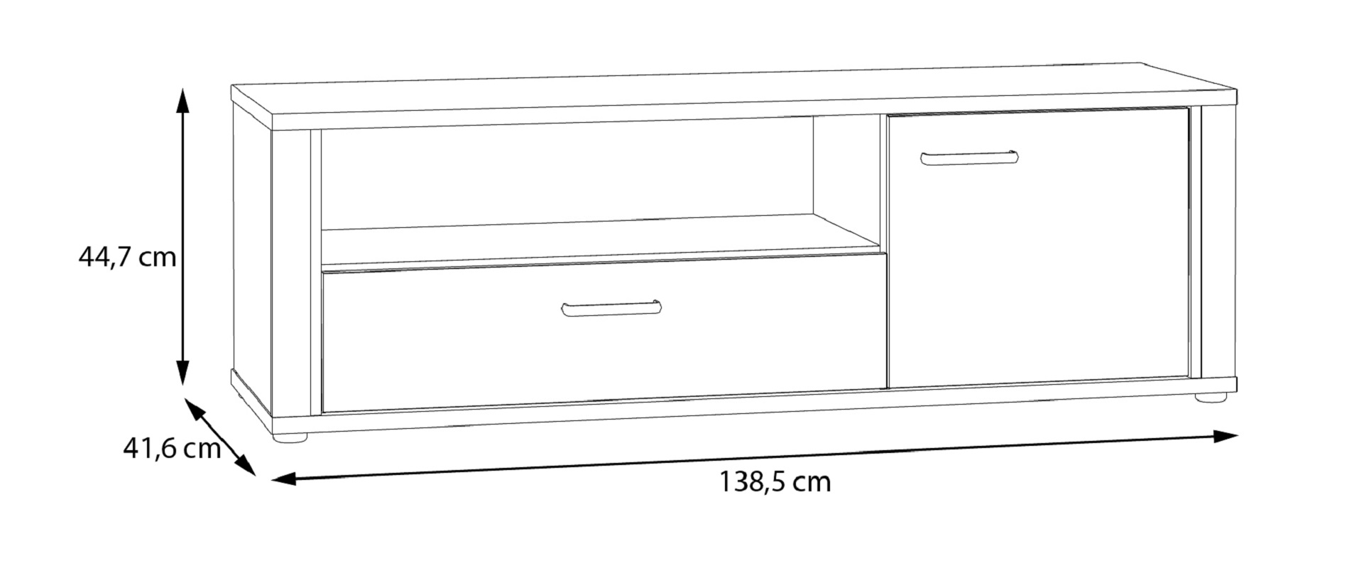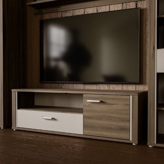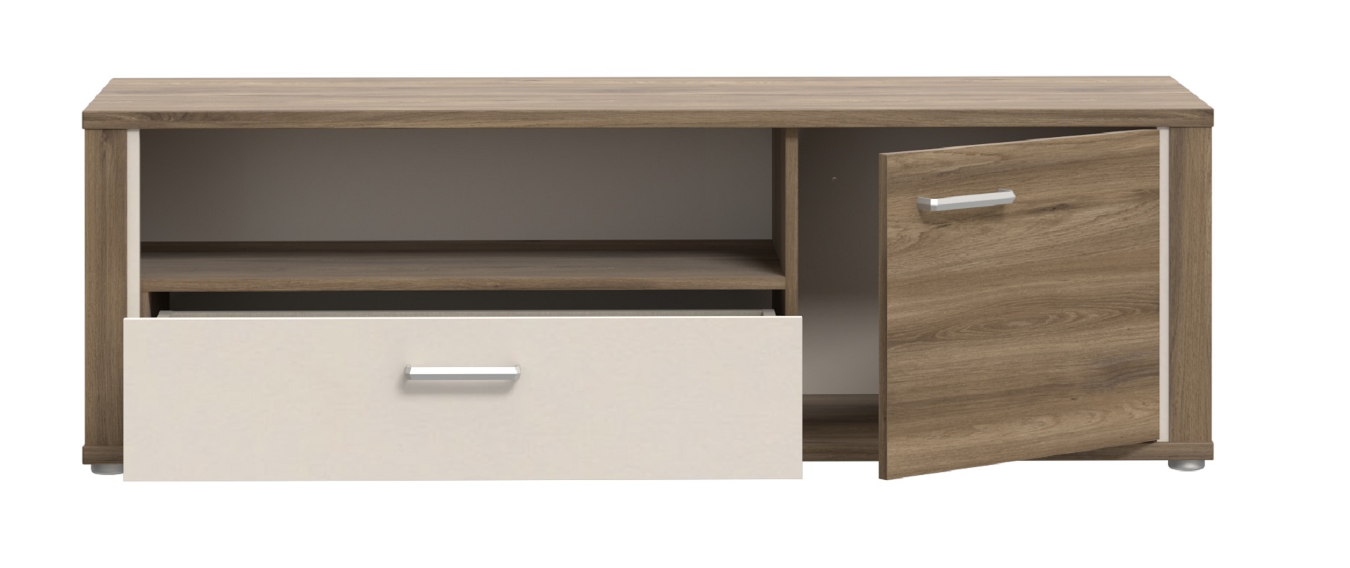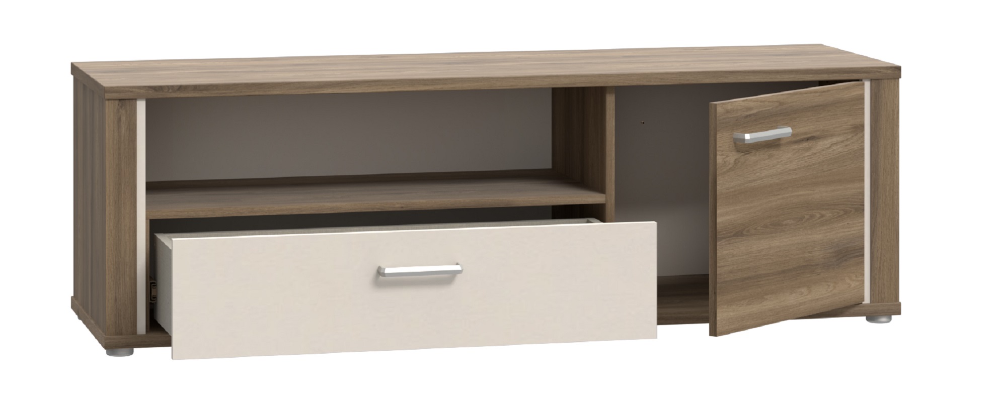 Szafka RTV pod telewizor Savios DDLT124R to funkcjonalny i elegancki element wystroju każdego pokoju dziennego lub jadalni. Wykonana z wysokiej jakości płyty meblowej w ciepłym odcieniu dębu valencia, ta szafka dodaje wnętrzu przytulności i charakteru, jednocześnie będąc solidną podstawą dla telewizora oraz przechowującą różnorodne akcesoria multimedialne.