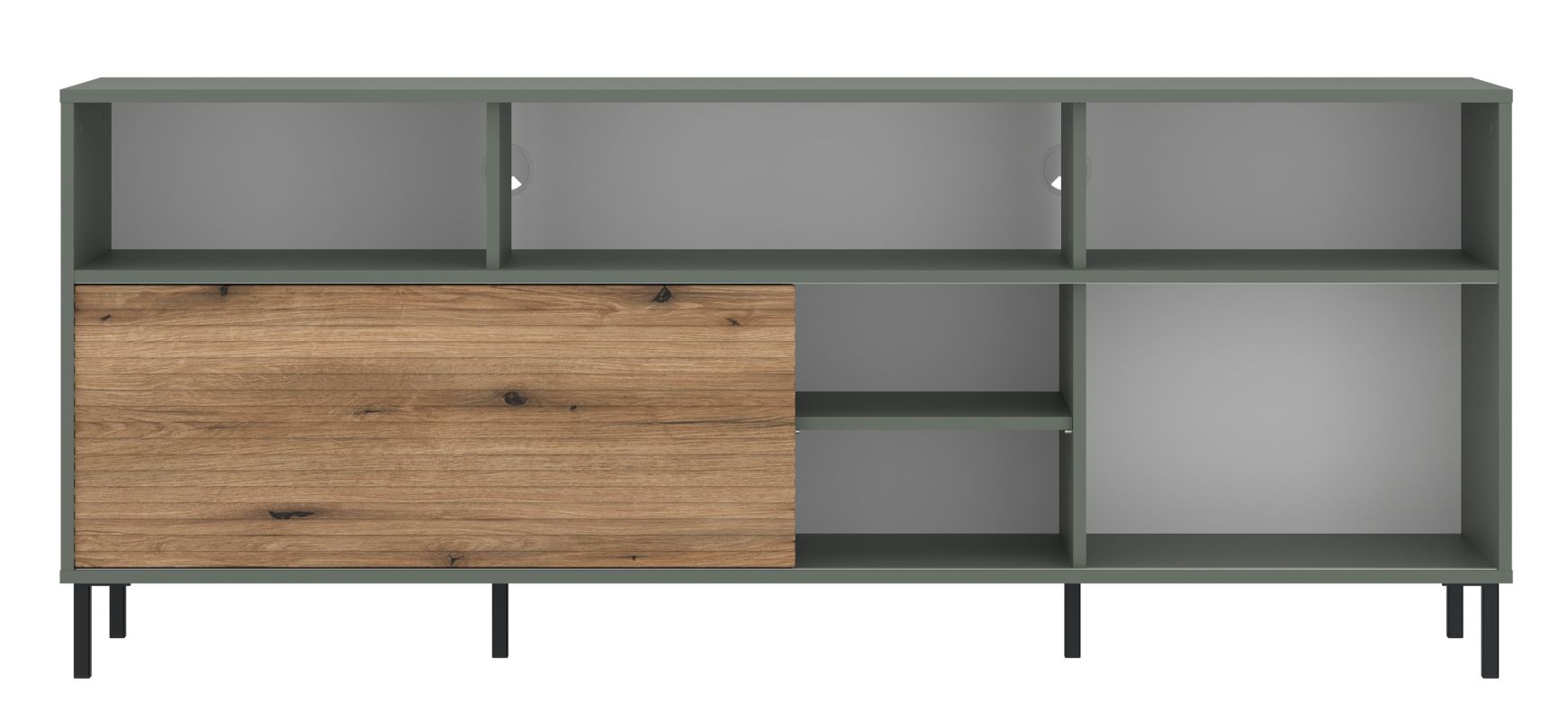 Połączenie faktur – gładkiej powierzchni ciemnozielonego korpusu z wyraźną strukturą drewna – sprawia, że mebel staje się oryginalnym punktem centralnym salonu. Bezuchwytowy, przesuwny front podkreśla estetykę prostych, geometrycznych linii i pozwala na zachowanie harmonii we wnętrzu.