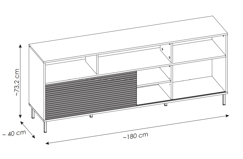 Szafka RTV Pozzi wyróżnia się minimalistyczną formą, osadzoną na wysokich metalowych nóżkach, które dodają jej lekkości i nowoczesnego charakteru. Front wykonany z płyty MDF został ozdobiony ryflowaniem, które subtelnie załamuje światło i tworzy efekt głębi.