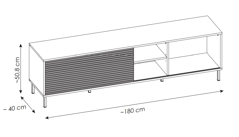 Mebel został zaprojektowany z myślą o praktycznym wykorzystaniu przestrzeni. Szafka RTV Pozzi 1D oferuje pojemne półki, które pomieszczą sprzęt multimedialny, konsole, dekoder czy kolekcję filmów. Dzięki przesuwnemu frontowi możliwe jest dyskretne ukrycie wybranych elementów, co pozwala utrzymać wizualny porządek i estetykę salonu.