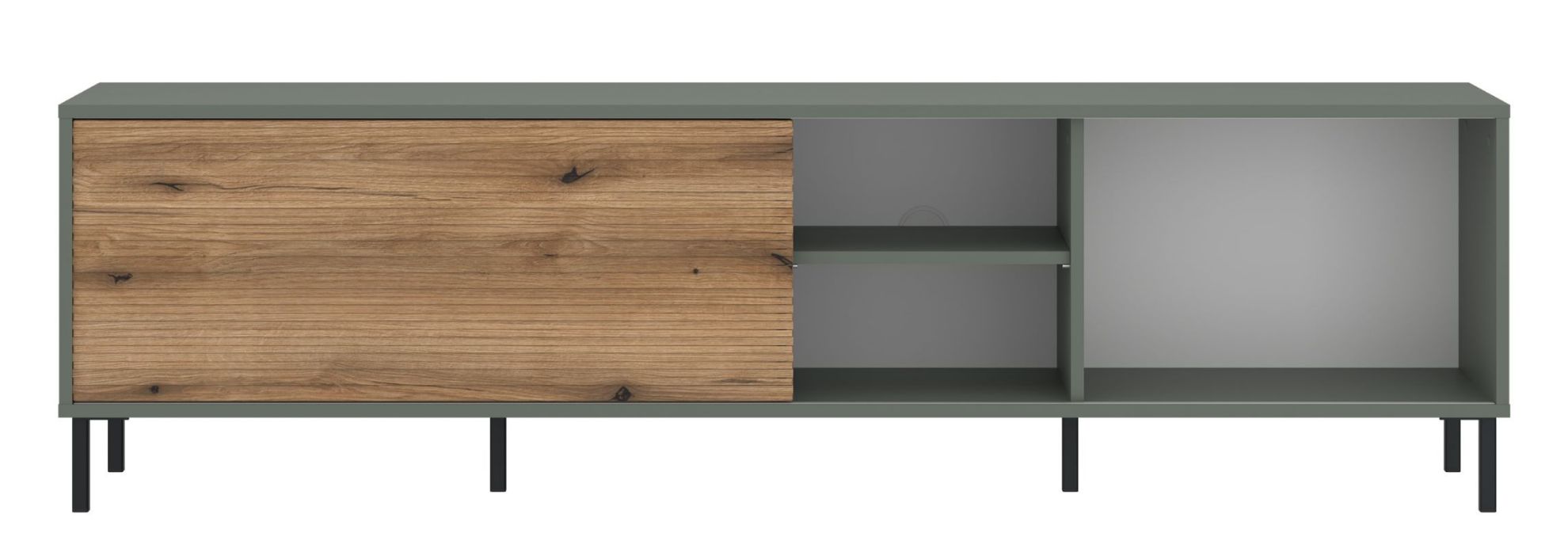 Charakterystycznym elementem szafki RTV Pozzi 1D jest ryflowany front w dekorze Dąb Coast Evoke, który nadaje meblowi elegancki i naturalny wygląd. Jego struktura, inspirowana drewnem, wprowadza do wnętrza ciepło i subtelne zróżnicowanie faktur. Z kolei korpus w kolorze szarozielonym stanowi nowoczesną bazę, która doskonale komponuje się z odcieniami drewna, czerni, grafitu czy beżu.