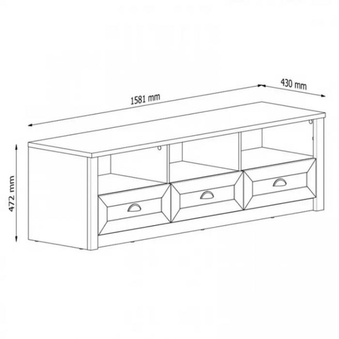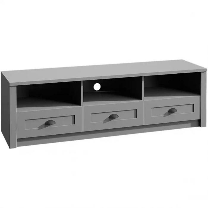 Szafka RTV Prowansja wyposażona w trzy szuflady oraz trzy wnęki. W centralnej tylnej części otwory na przewody. Wykonana z płyty laminowanej, odpornej na uszkodzenia. Uchwyty metalowe w postaci muszelek w kolorze czarnym. Produkt pakowany w dwie paczki. Do samodzielnego montażu.